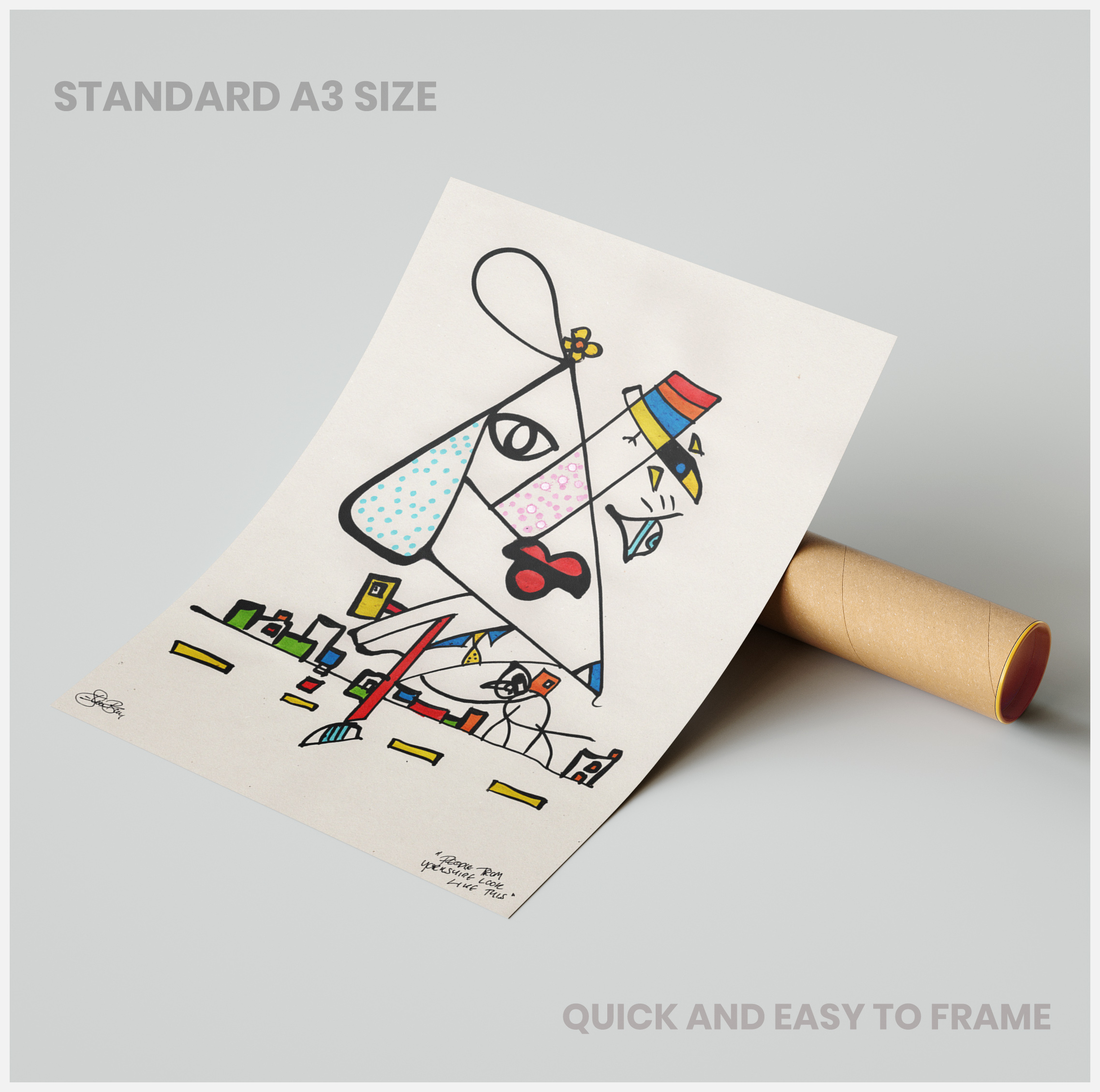 Size is A3 (approx 42×30 cm or 11.5 x 16.5 inches), so really easy and economical to frame.