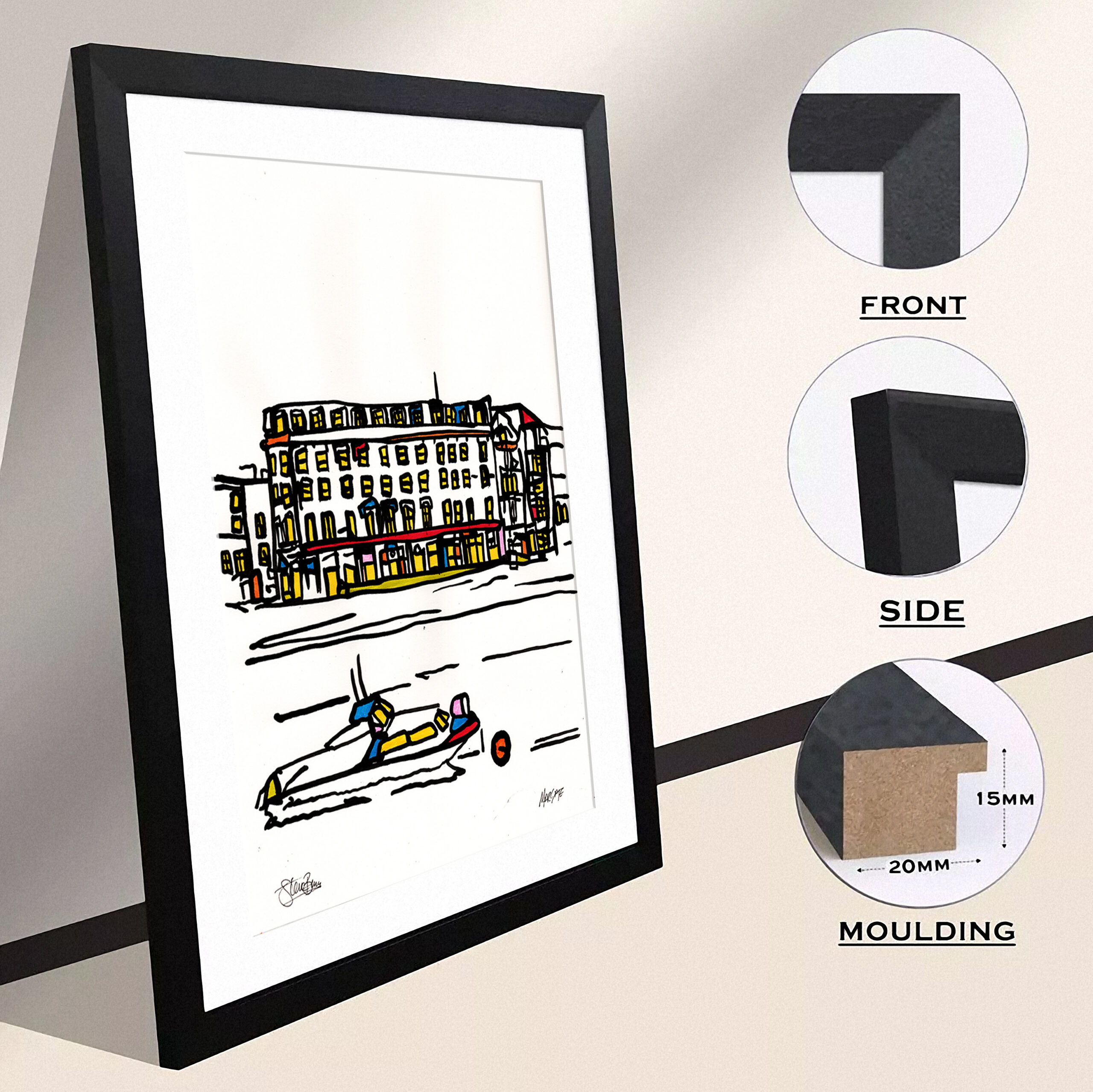 It will arrive with you framed in either plain UK-made Black, White or light Oak 20mm wide/15mm deep thin wood (MDF) with a white mount (the card surround) and is ready to hang straight from the box.