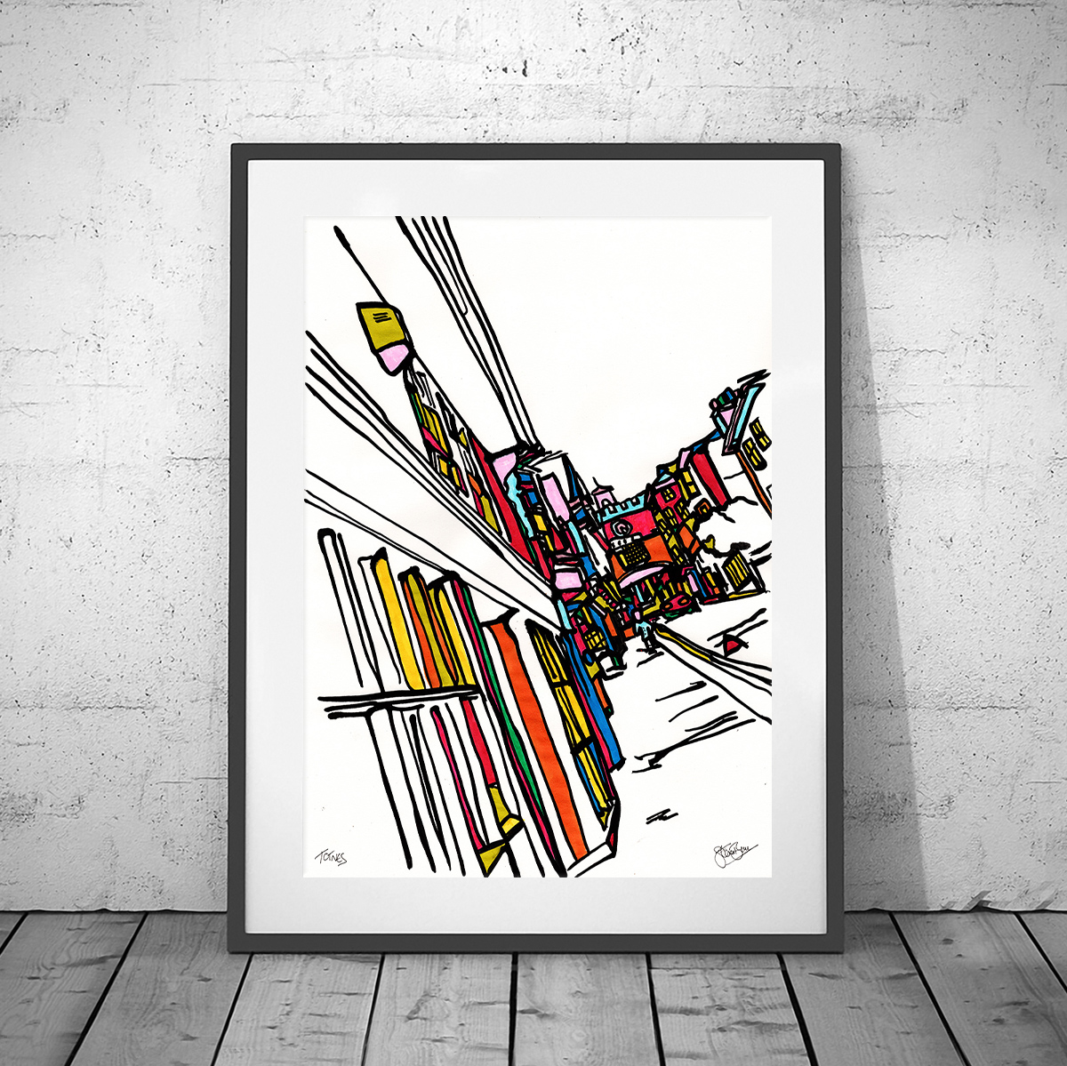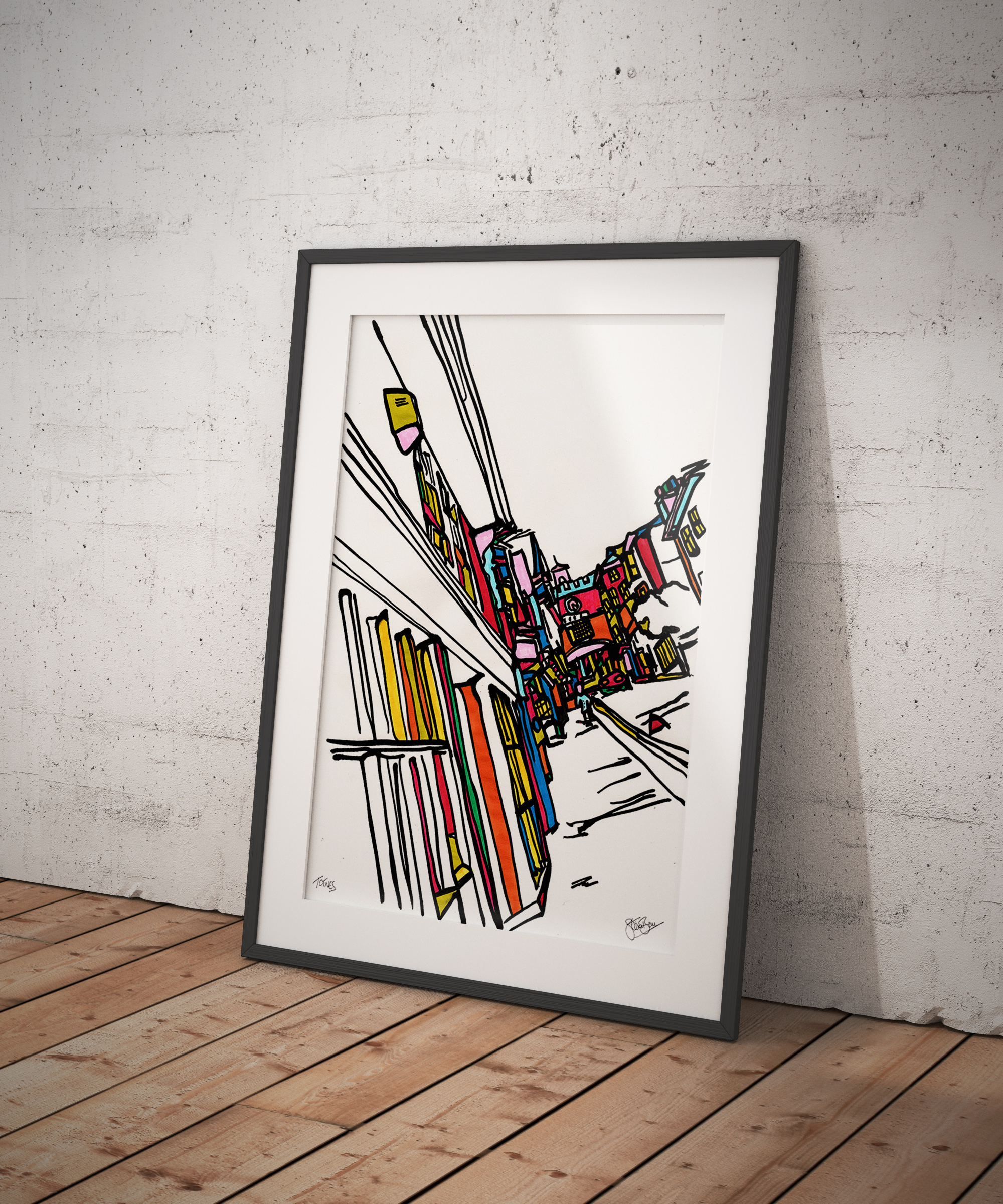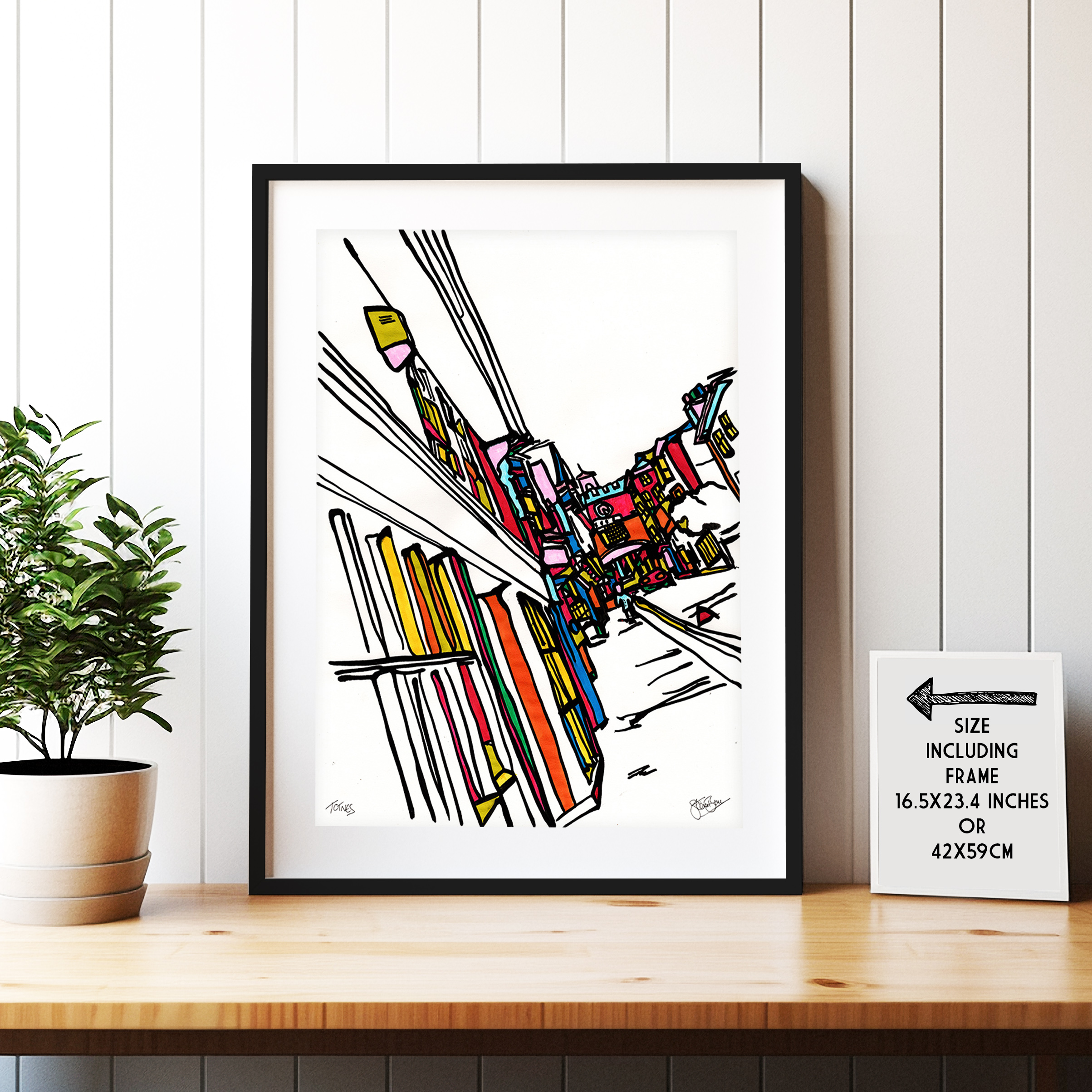 A framed original acrylic Totnes painting onto A3 (30x42cm), very lightly textured recycled cartridge paper.
