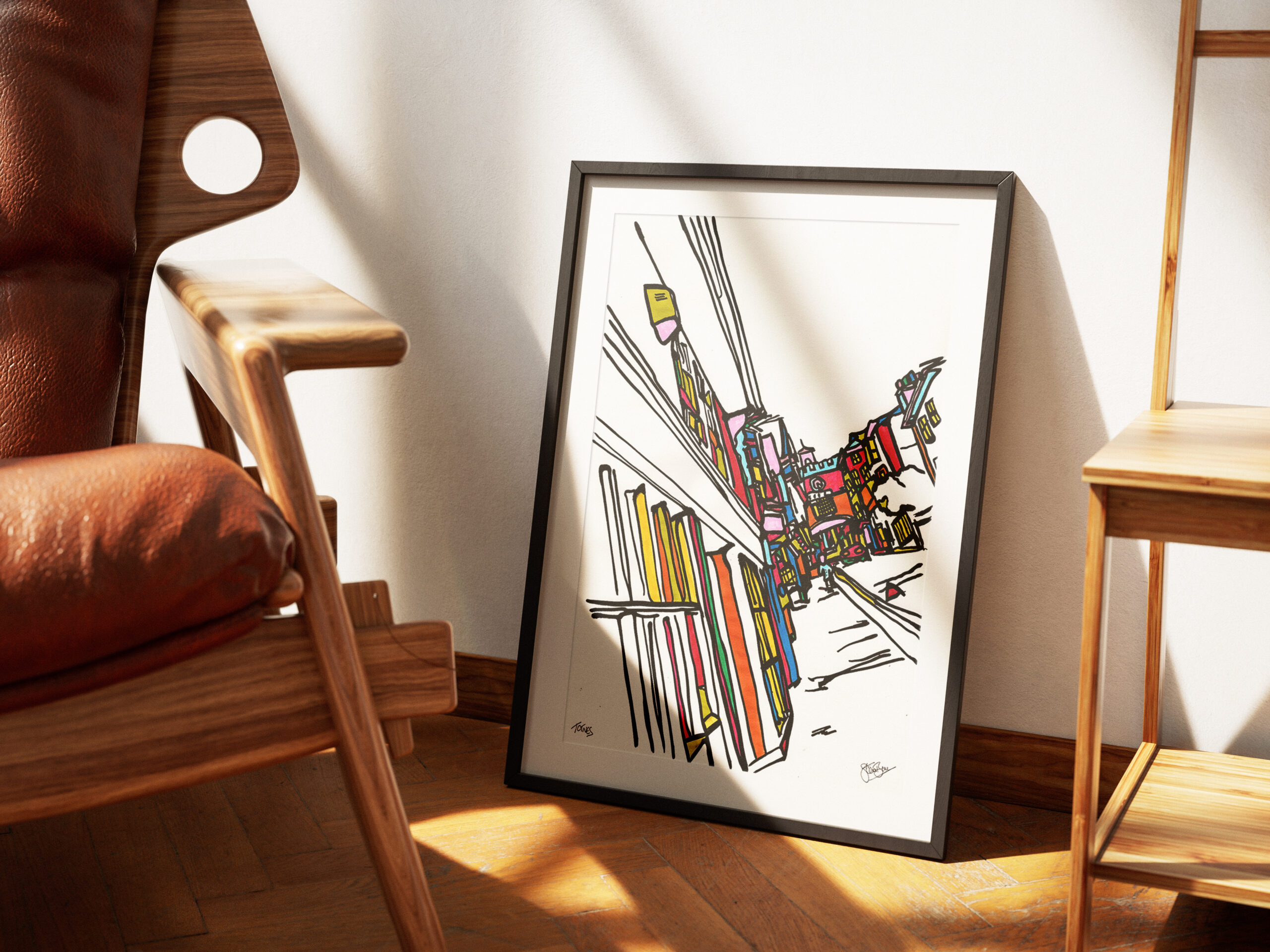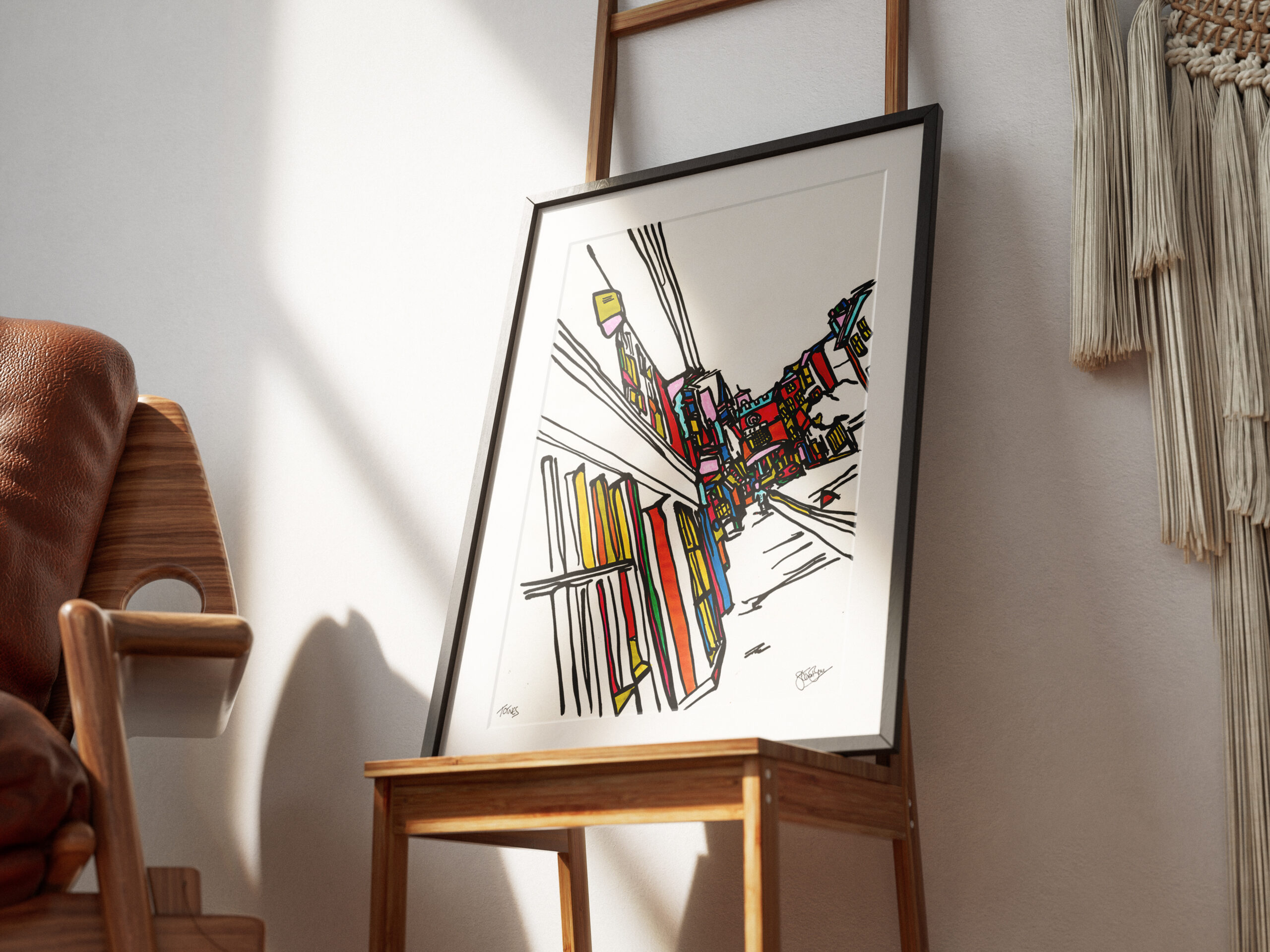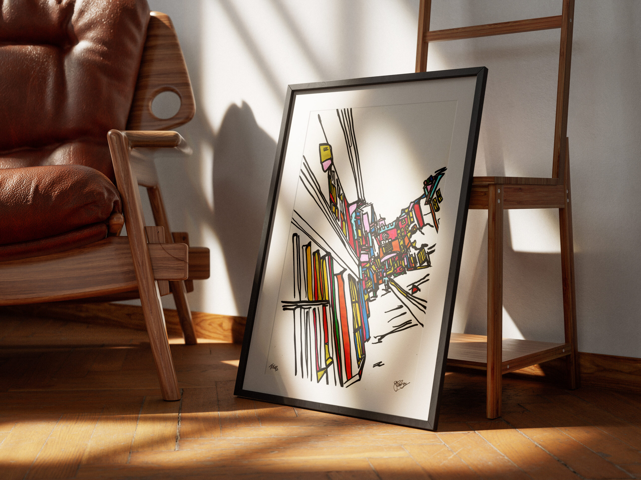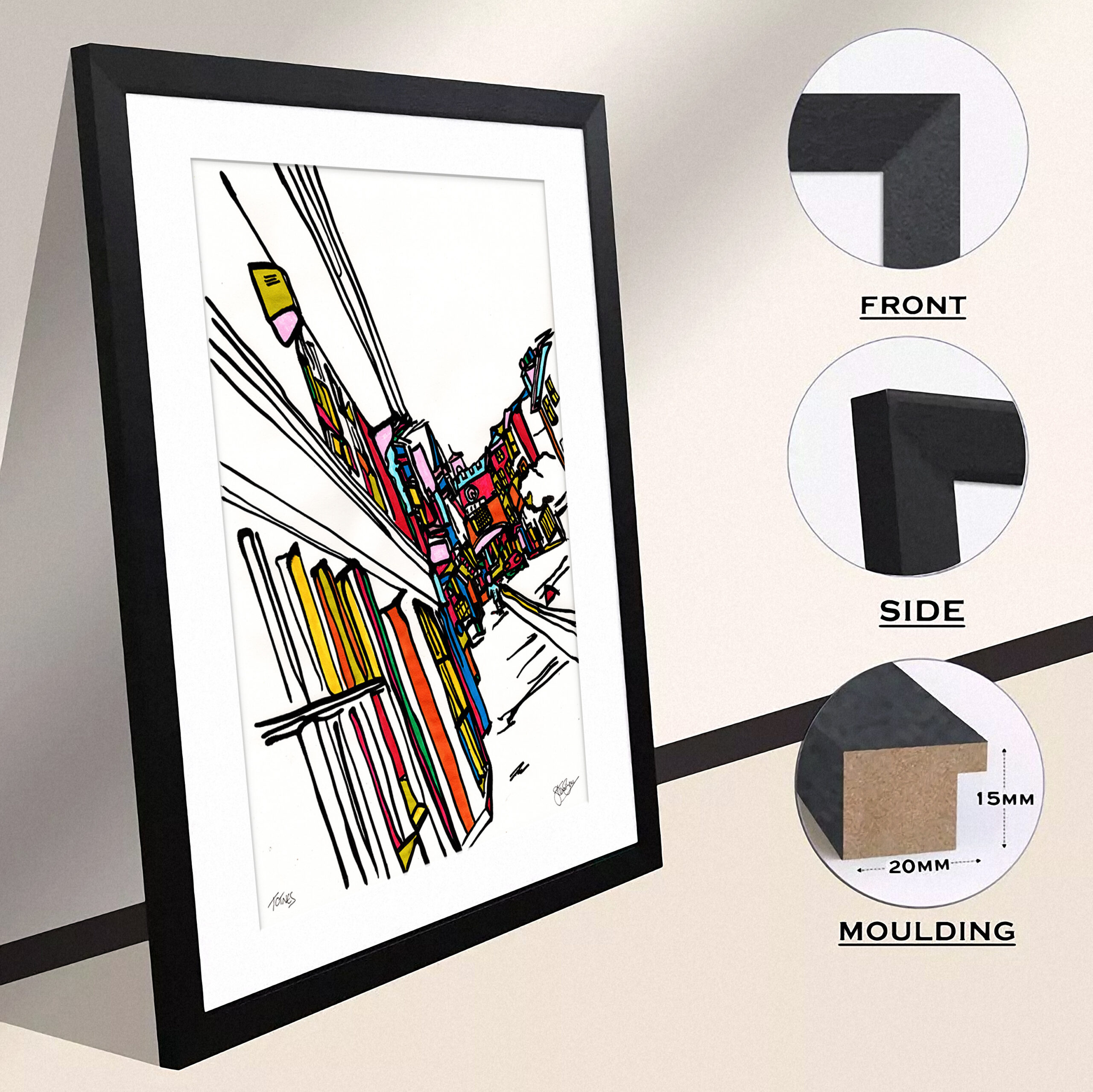 It will arrive with you framed in either plain UK-made Black, White or light Oak 20mm wide/15mm deep thin wood (MDF) with a white mount (the card surround) and is ready to hang straight from the box.