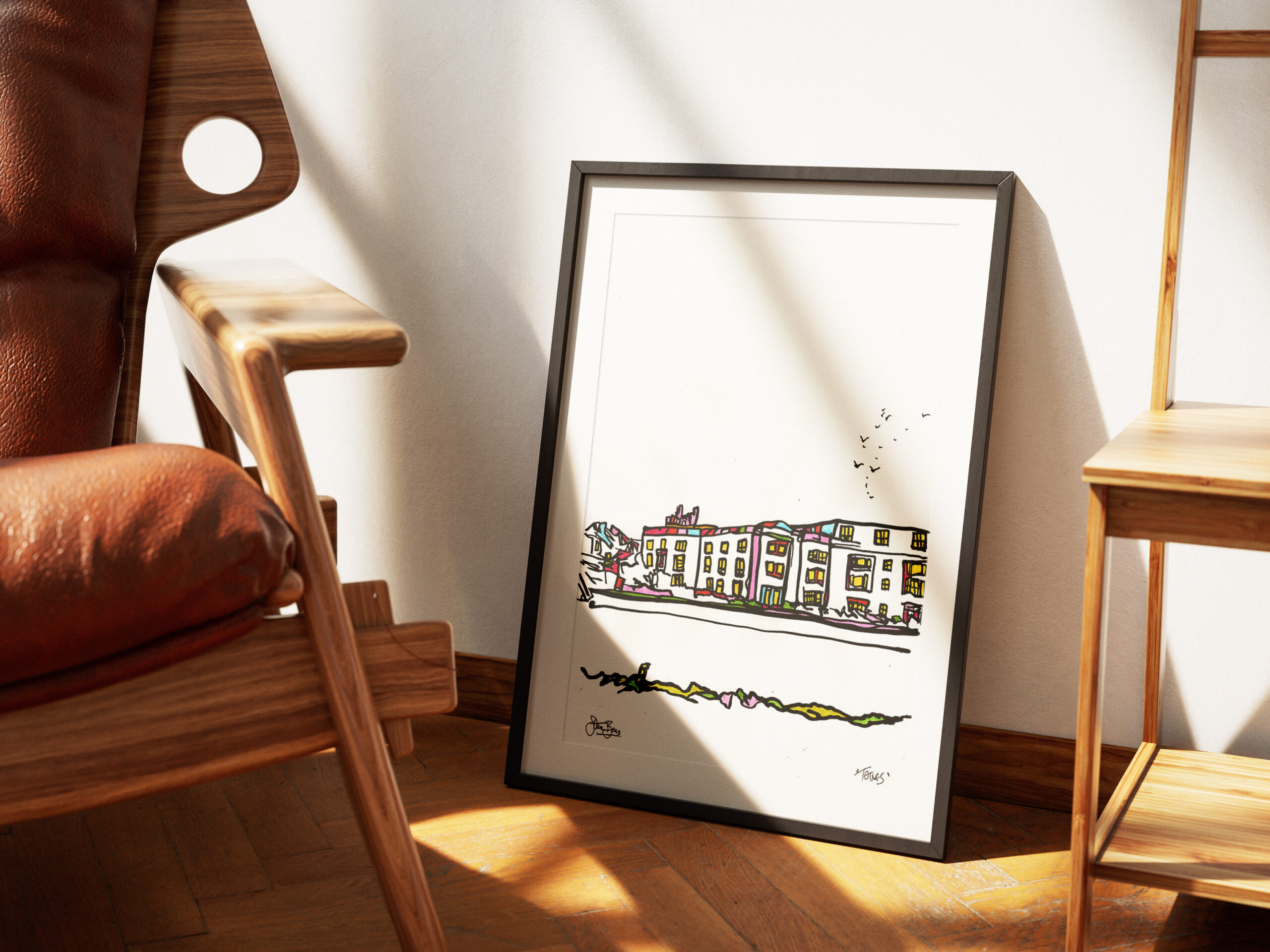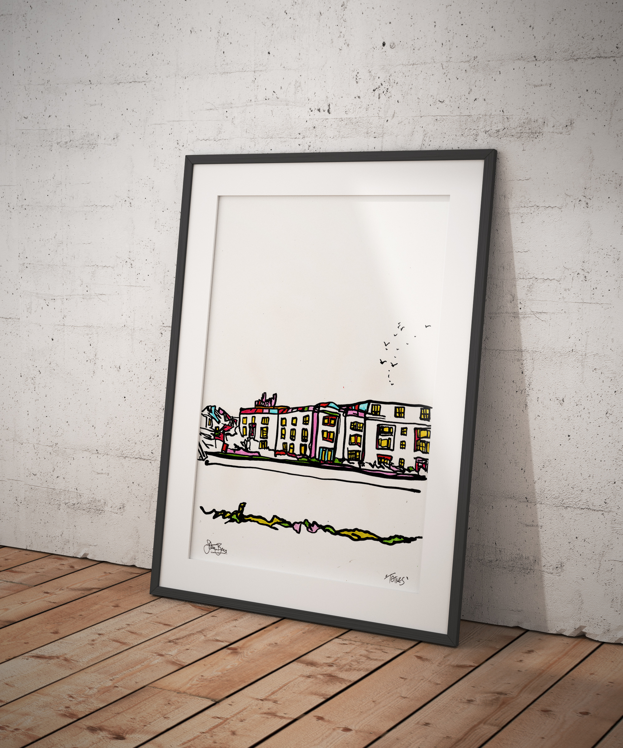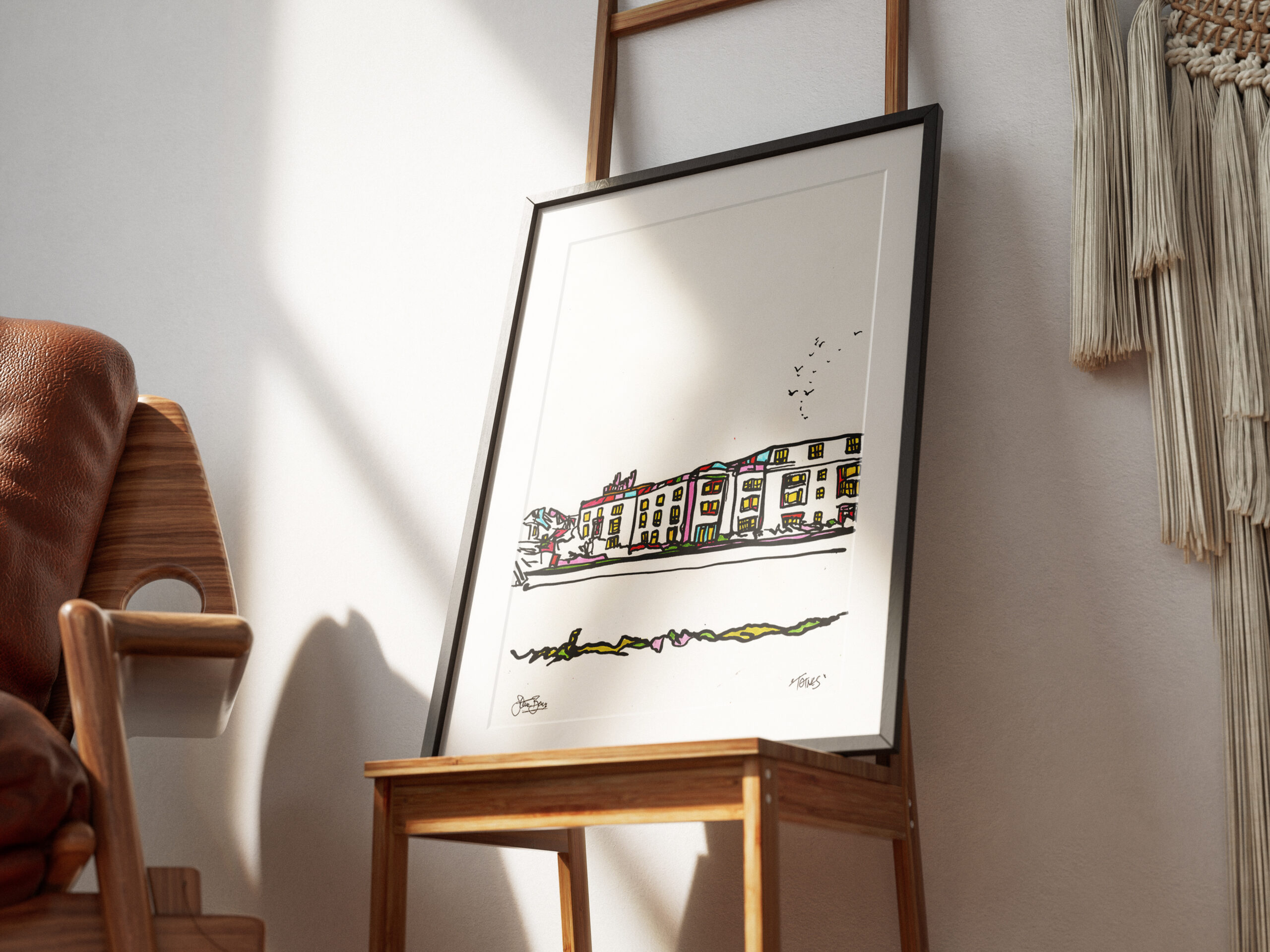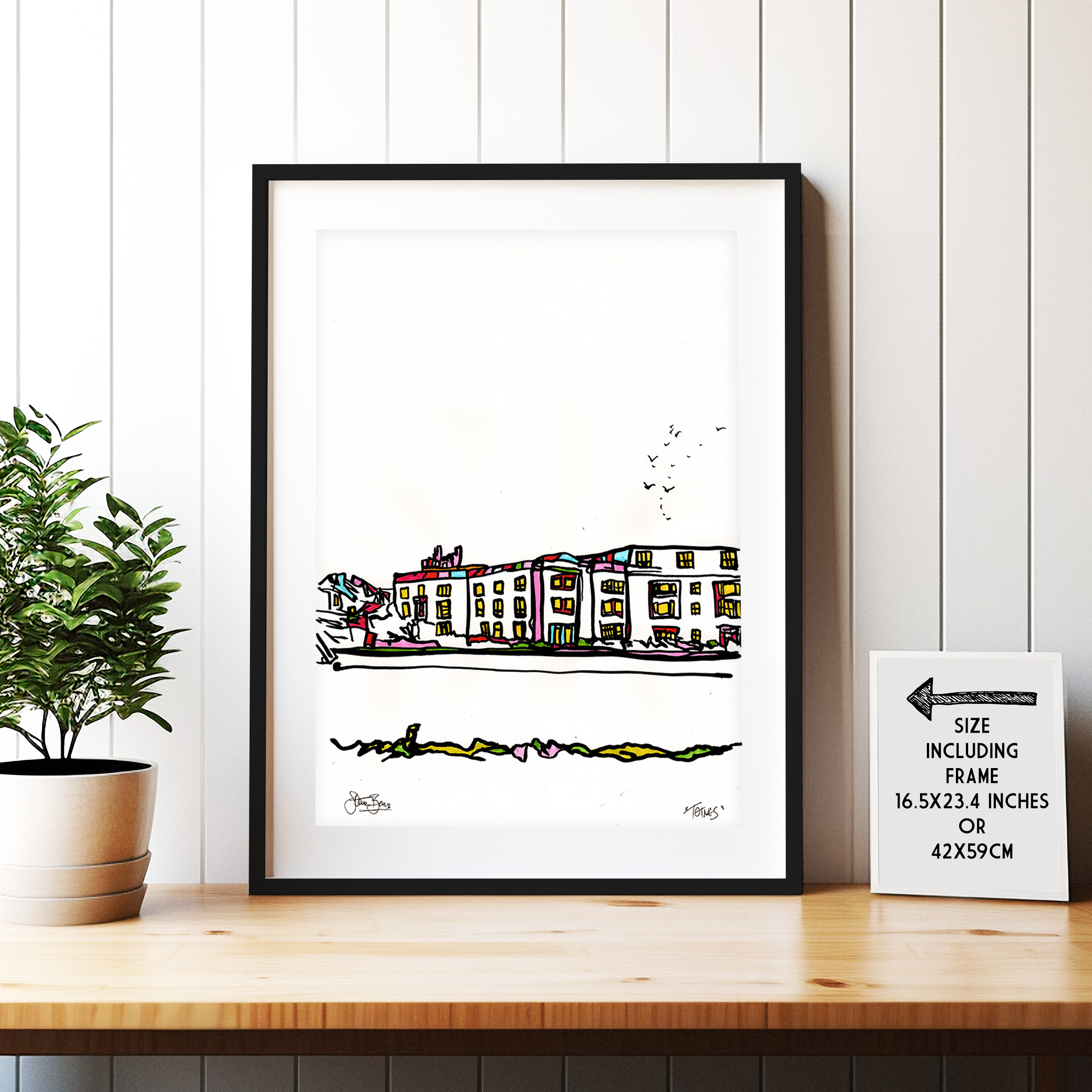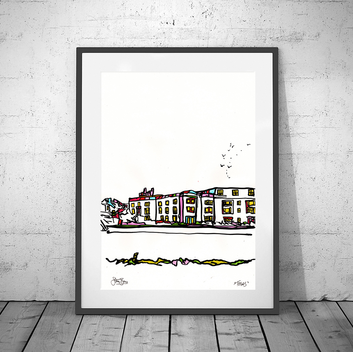 A framed original acrylic Totnes painting onto A3 (30x42cm), very lightly textured recycled cartridge paper.