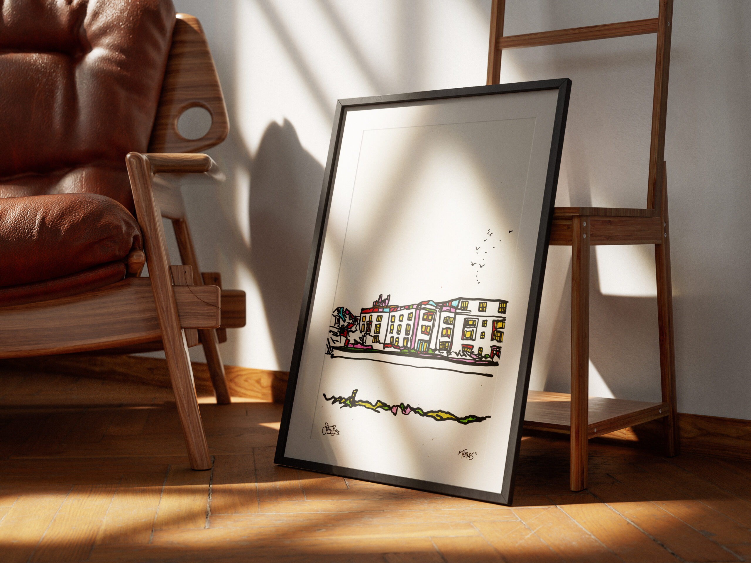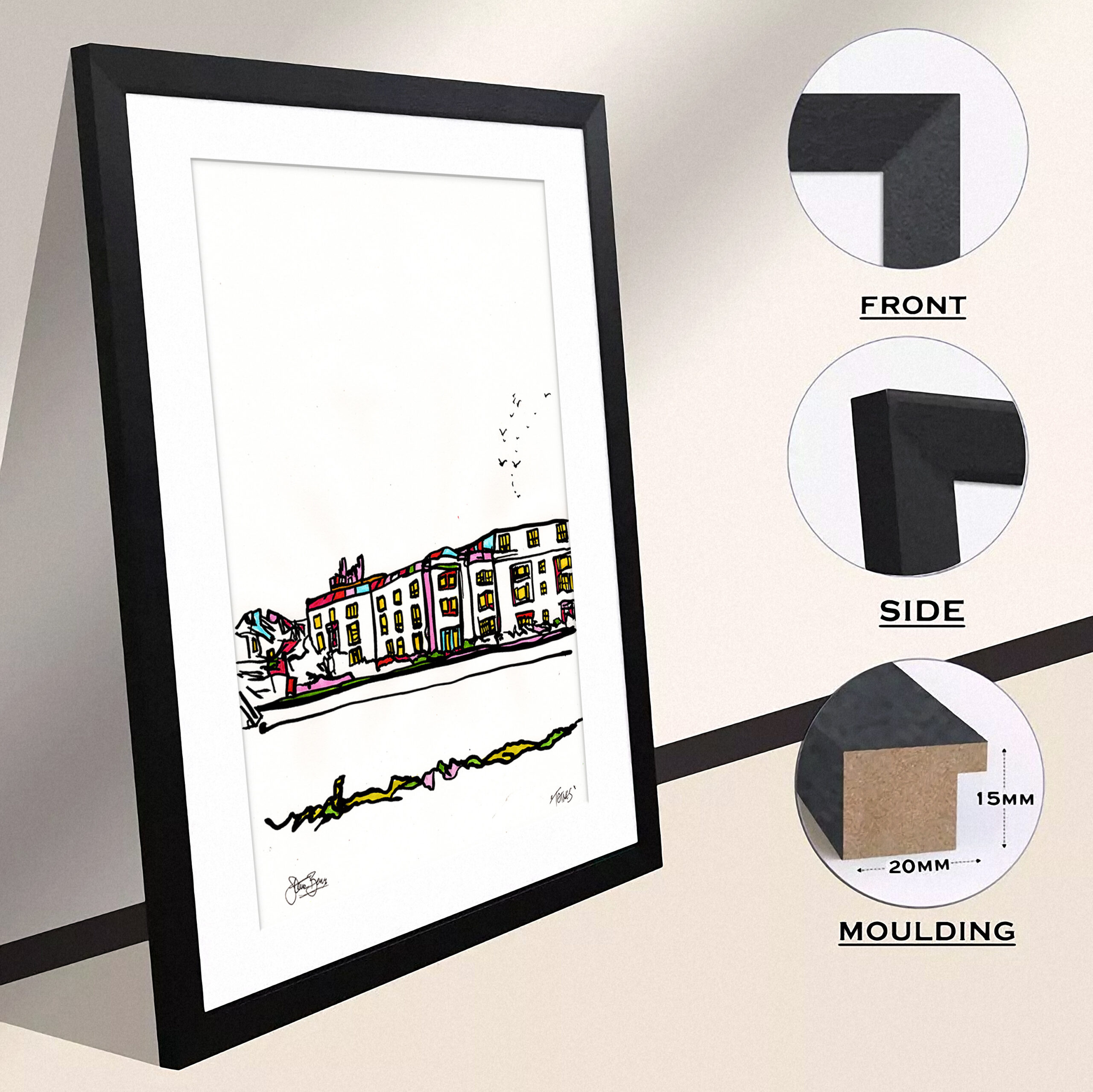 It will arrive with you framed in either plain UK-made Black, White or light Oak 20mm wide/15mm deep thin wood (MDF) with a white mount (the card surround) and is ready to hang straight from the box.