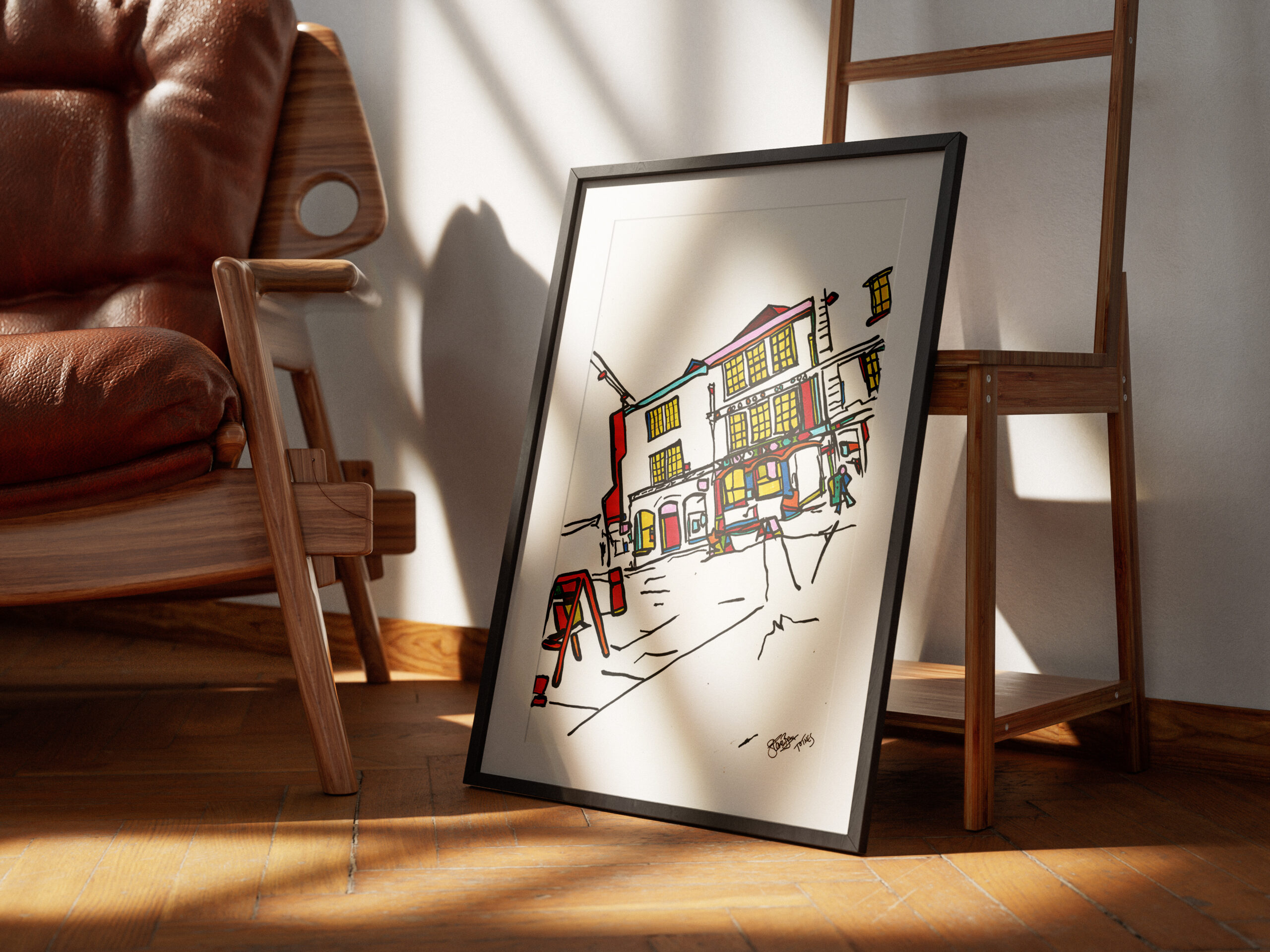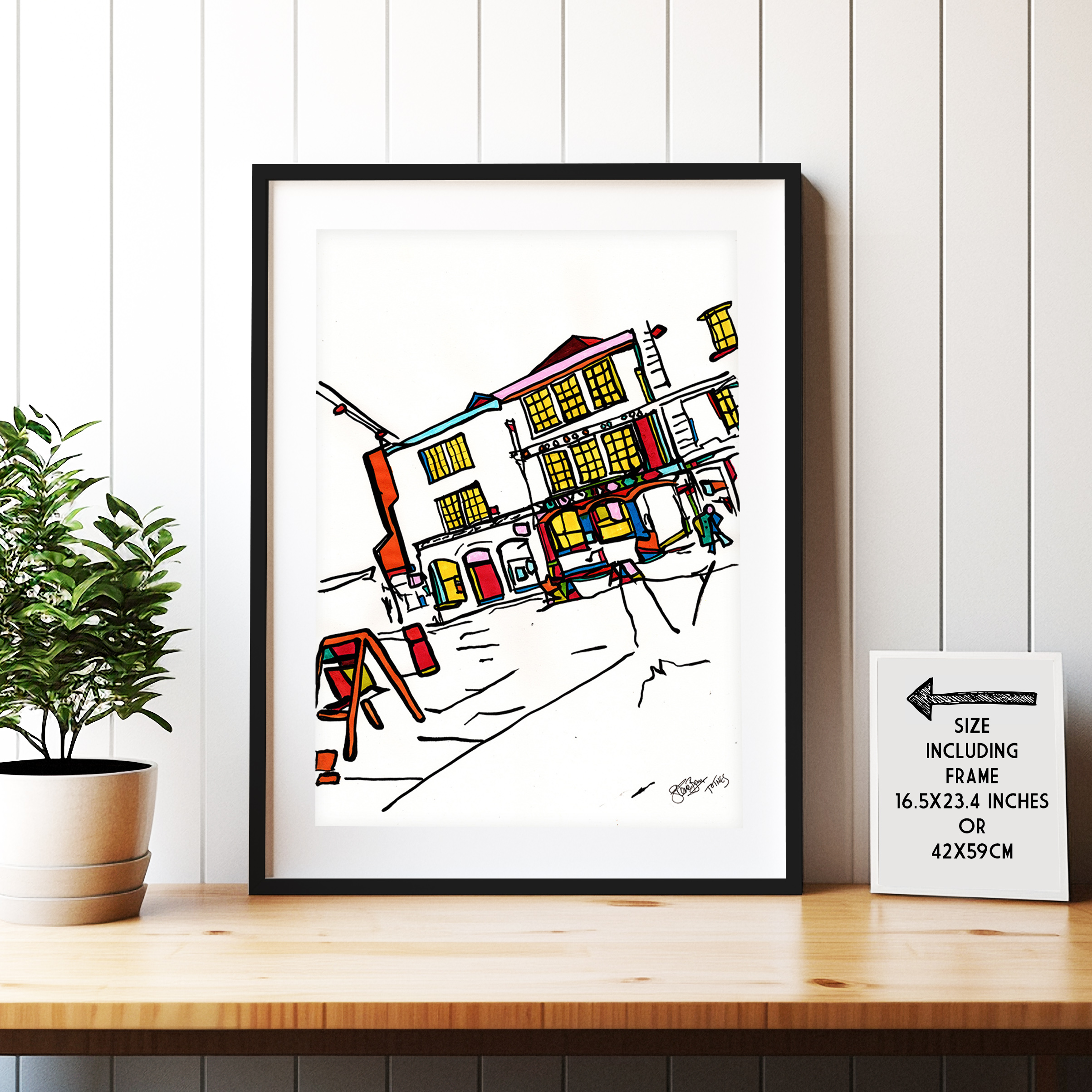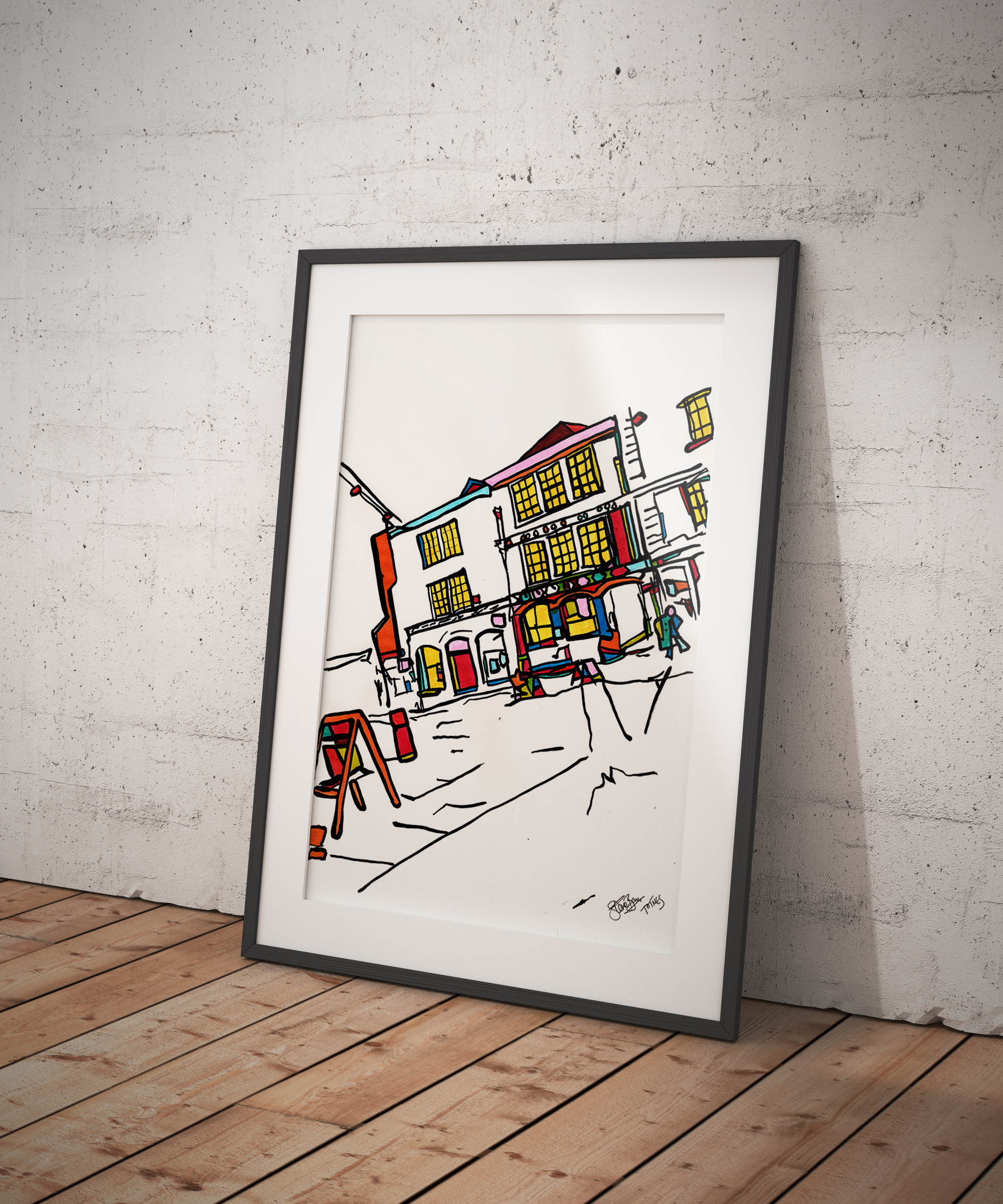 A framed original acrylic Totnes painting onto A3 (30x42cm), very lightly textured recycled cartridge paper.
