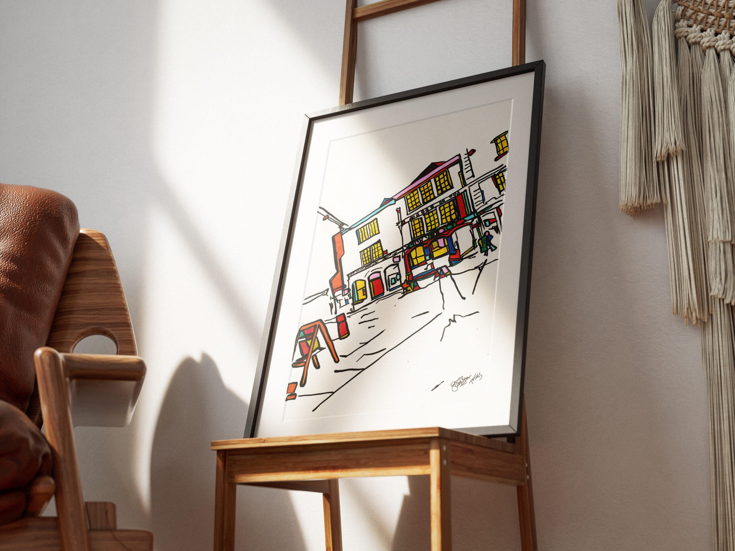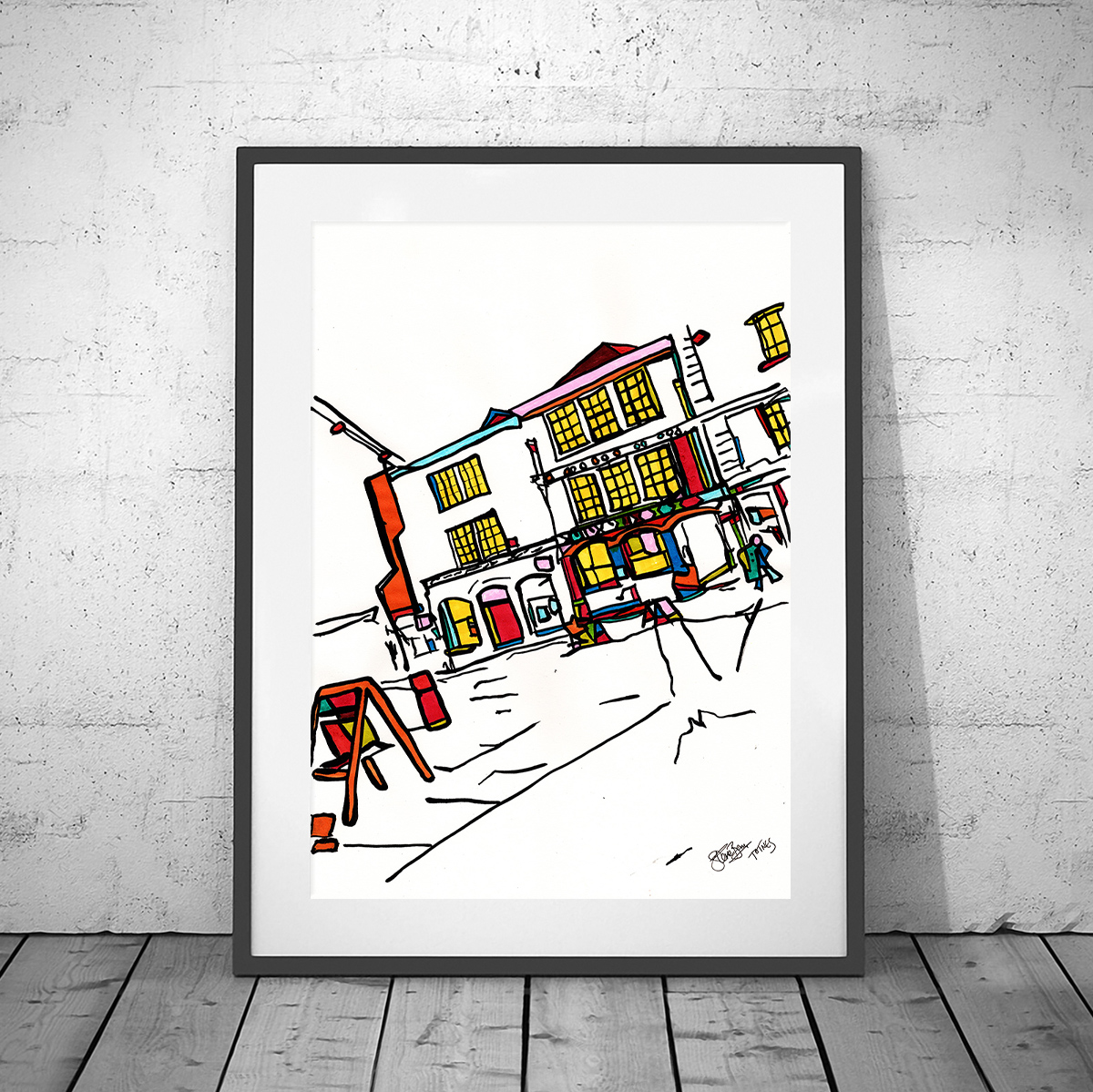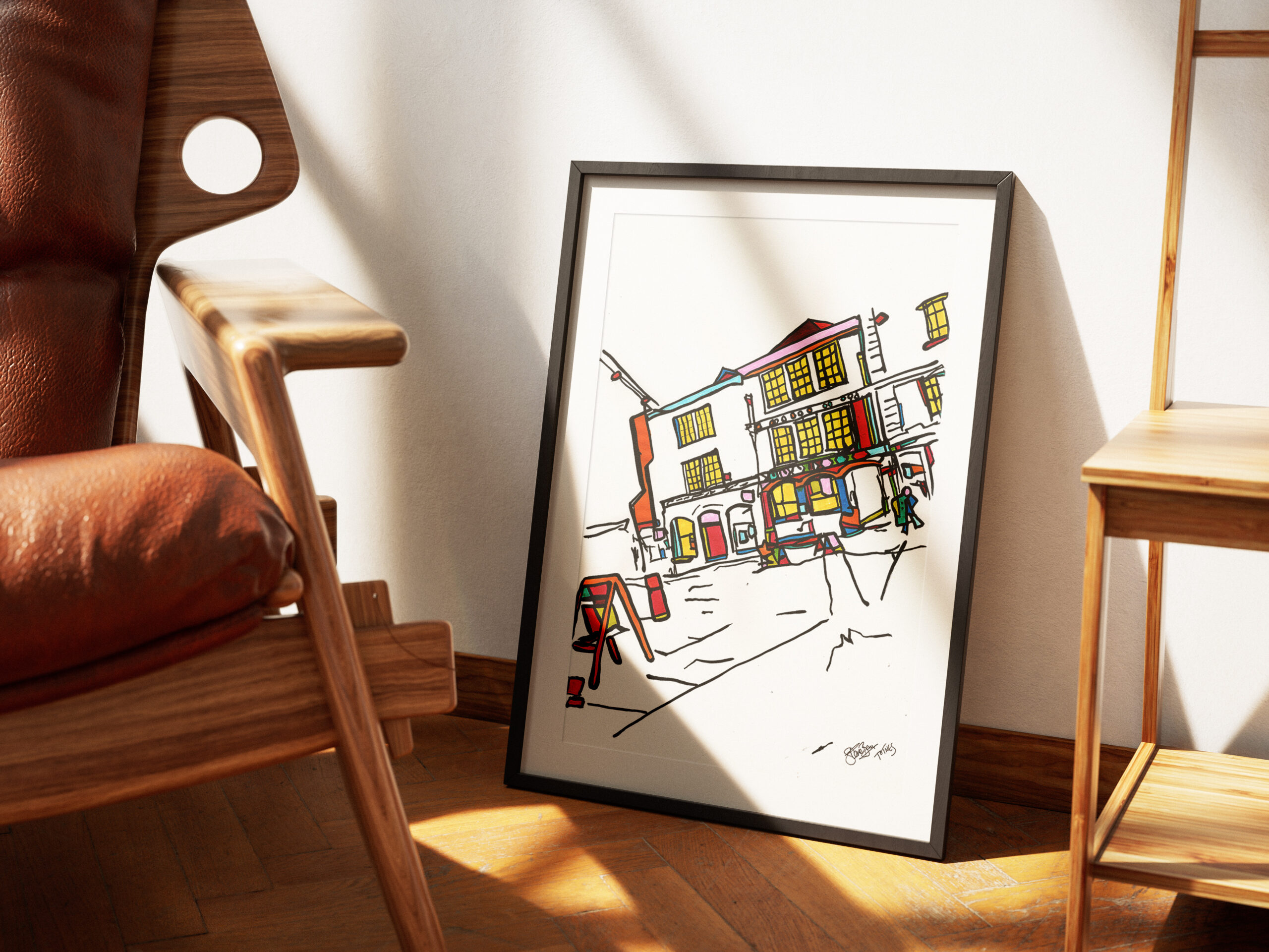 A framed original acrylic Totnes painting onto A3 (30x42cm), very lightly textured recycled cartridge paper.
