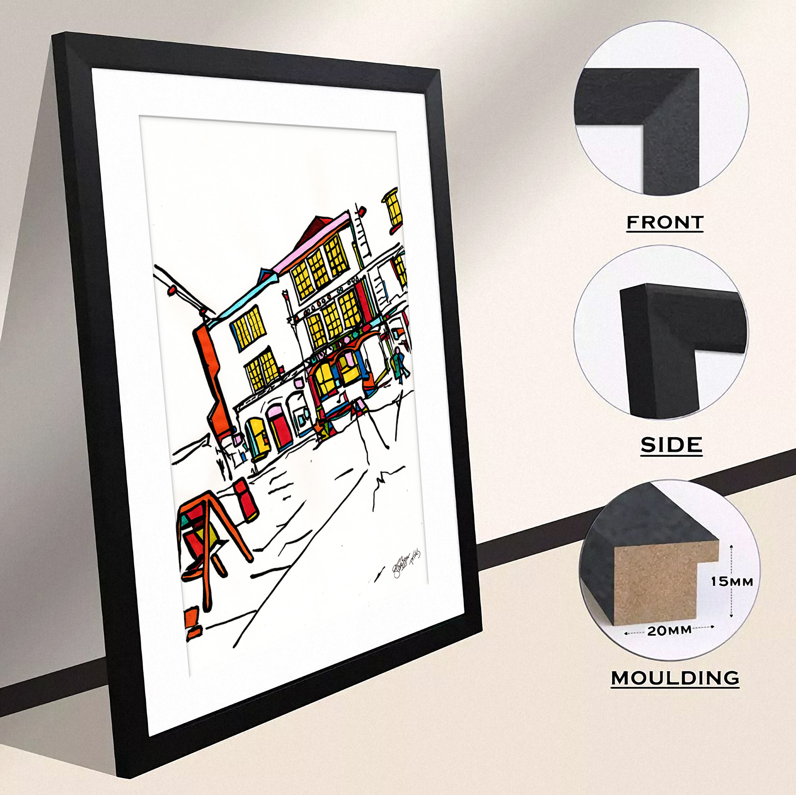It will arrive with you framed in either plain UK-made Black, White or light Oak 20mm wide/15mm deep thin wood (MDF) with a white mount (the card surround) and is ready to hang straight from the box.