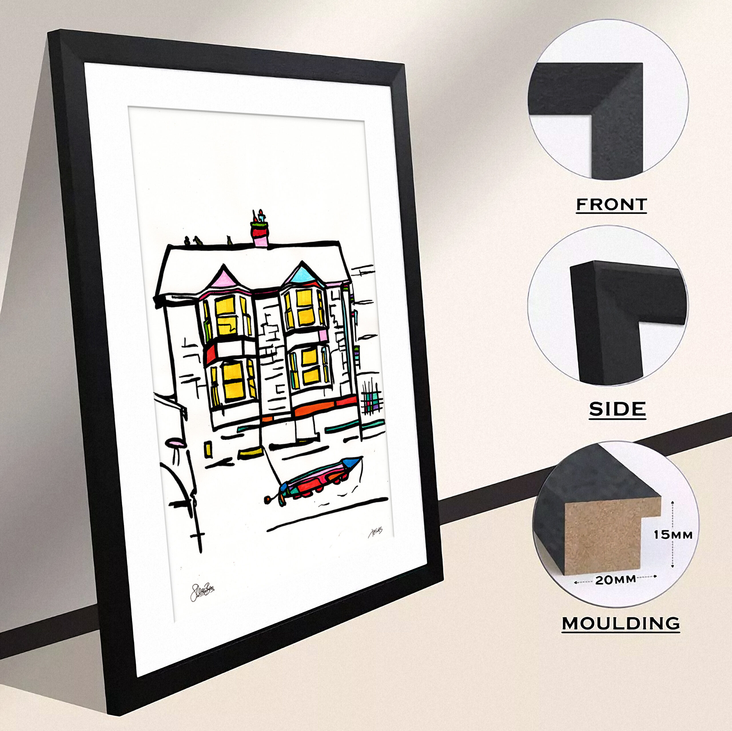 It will arrive with you framed in either plain UK-made Black, White or light Oak 20mm wide/15mm deep thin wood (MDF) with a white mount (the card surround) and is ready to hang straight from the box.