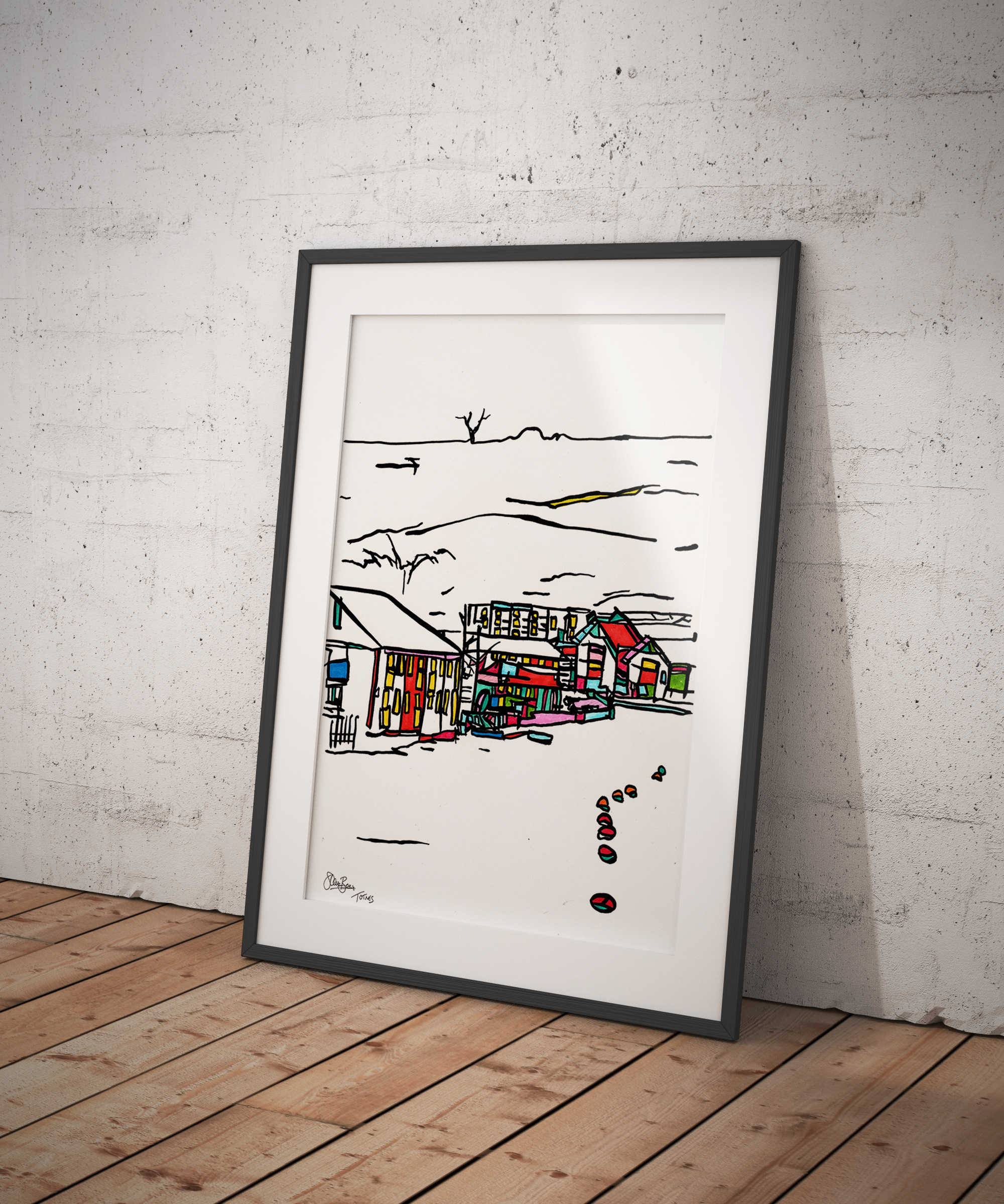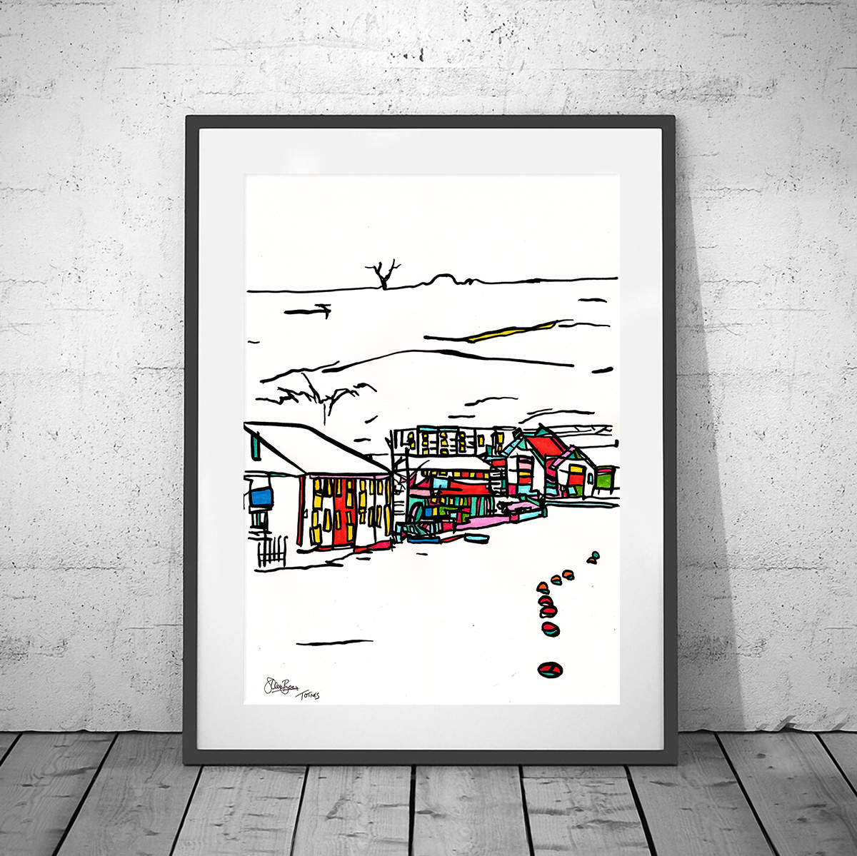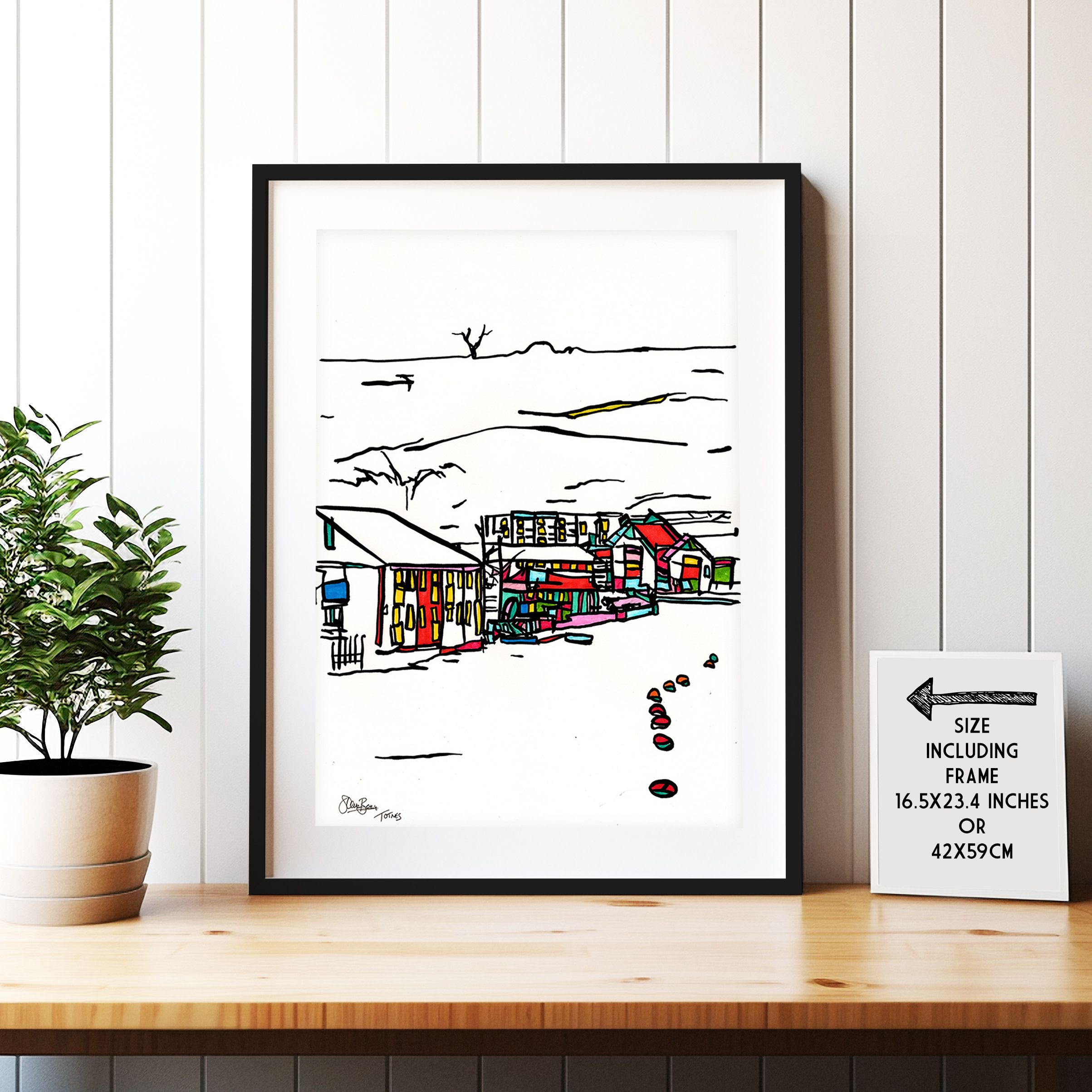 A framed original acrylic Totnes painting onto A3 (30x42cm), very lightly textured recycled cartridge paper.