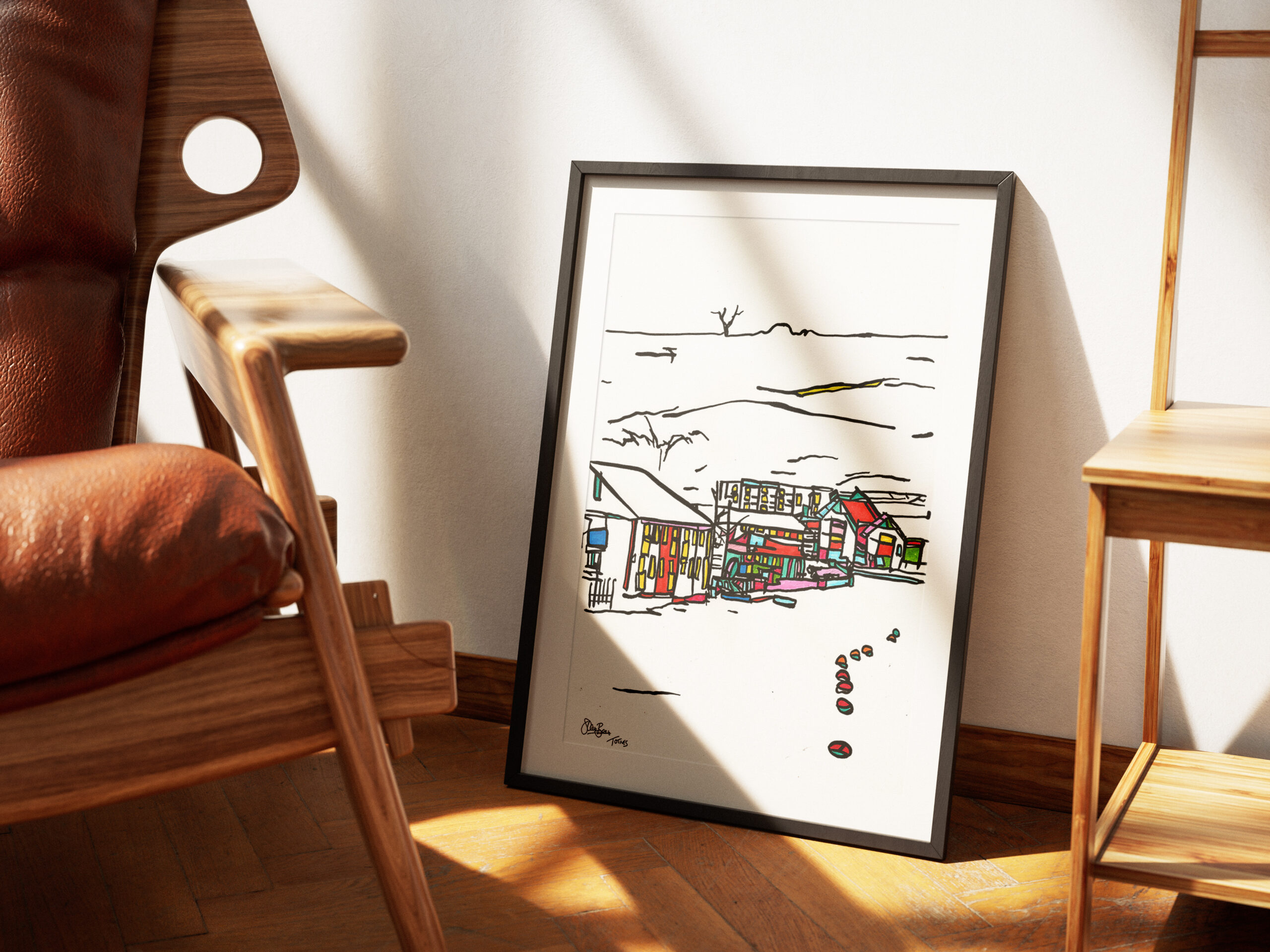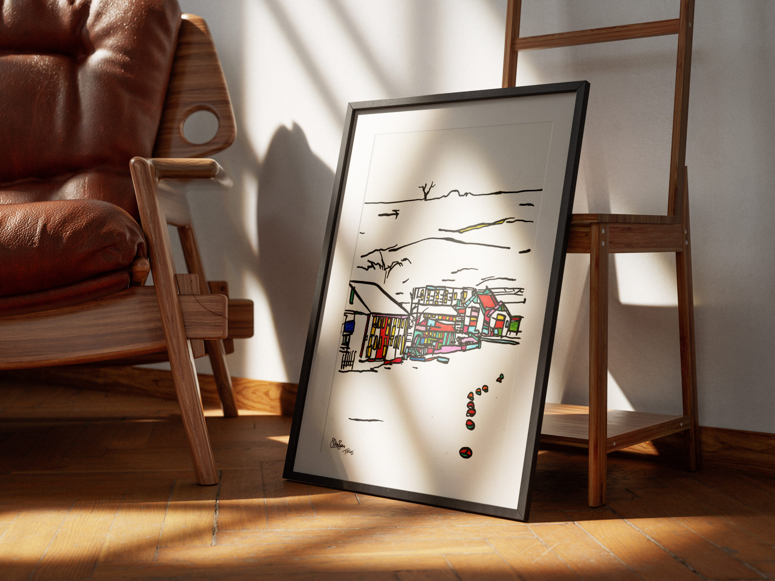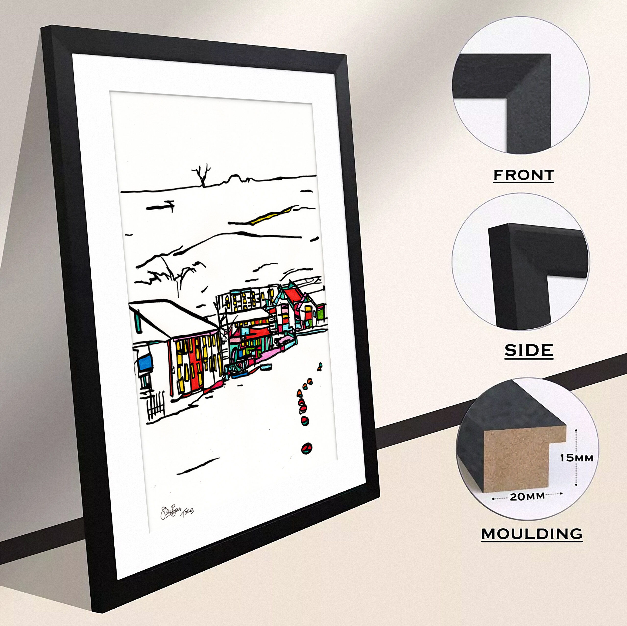 It will arrive with you framed in either plain UK-made Black, White or light Oak 20mm wide/15mm deep thin wood (MDF) with a white mount (the card surround) and is ready to hang straight from the box.