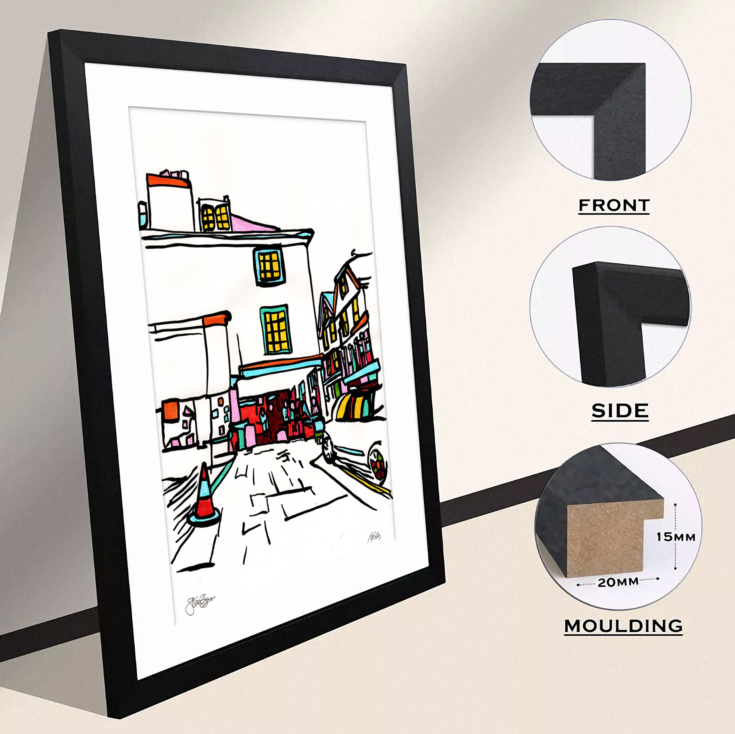 It will arrive with you framed in either plain UK-made Black, White or light Oak 20mm wide/15mm deep thin wood (MDF) with a white mount (the card surround) and is ready to hang straight from the box.