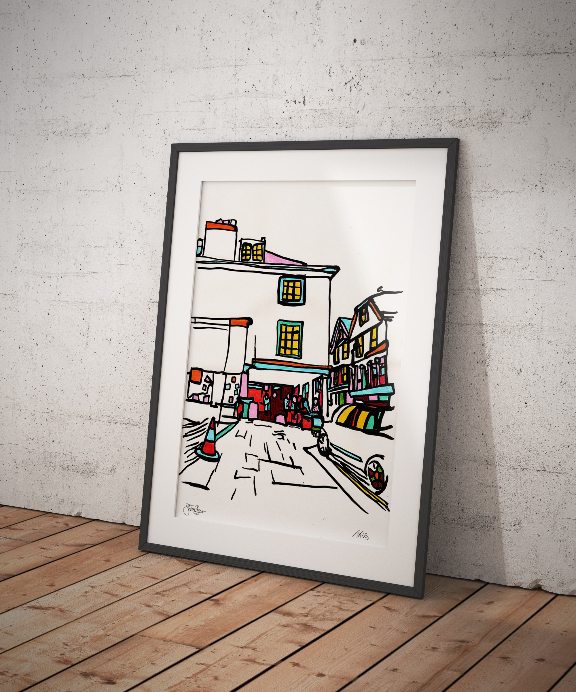 A framed original acrylic Totnes painting onto A3 (30x42cm), very lightly textured recycled cartridge paper.