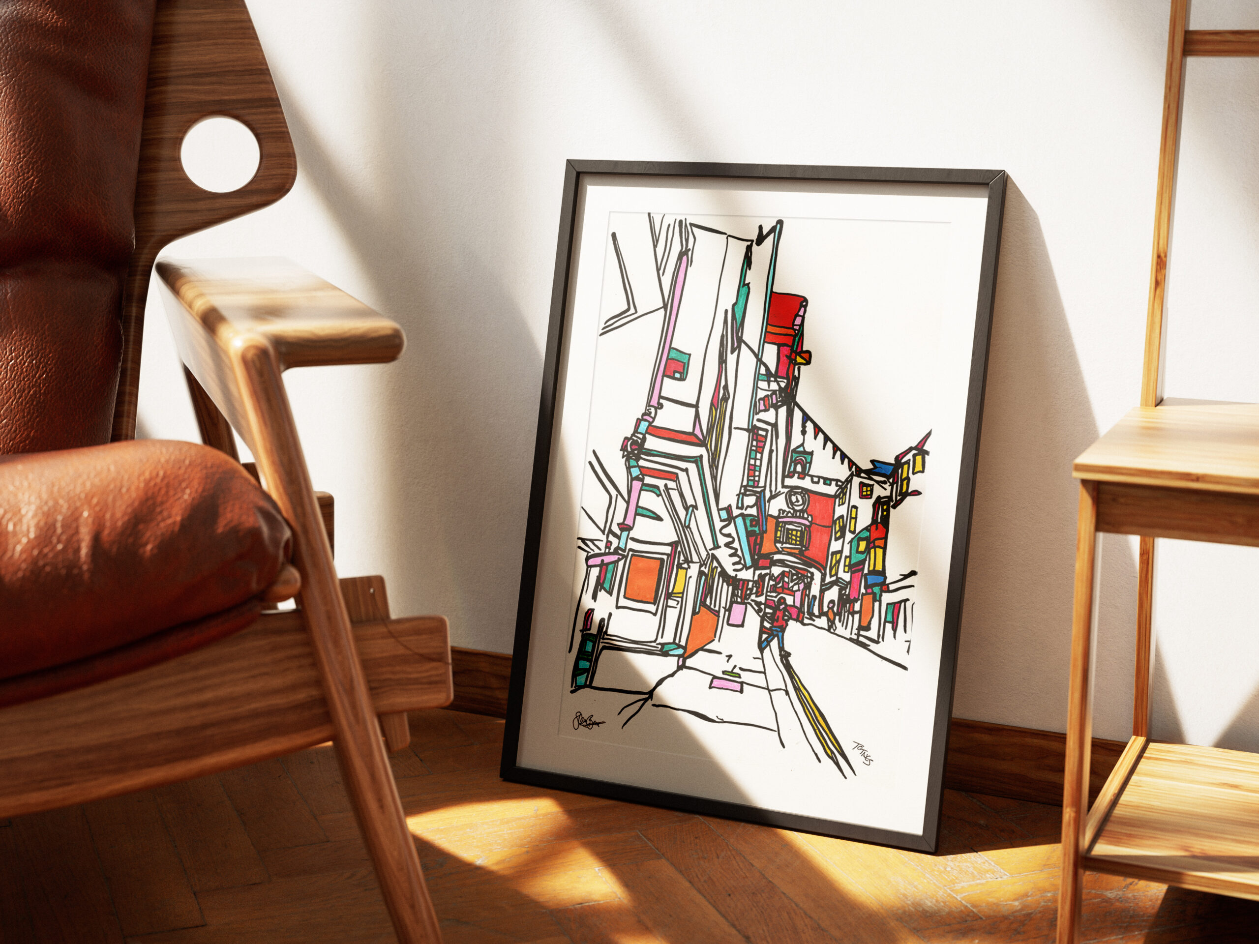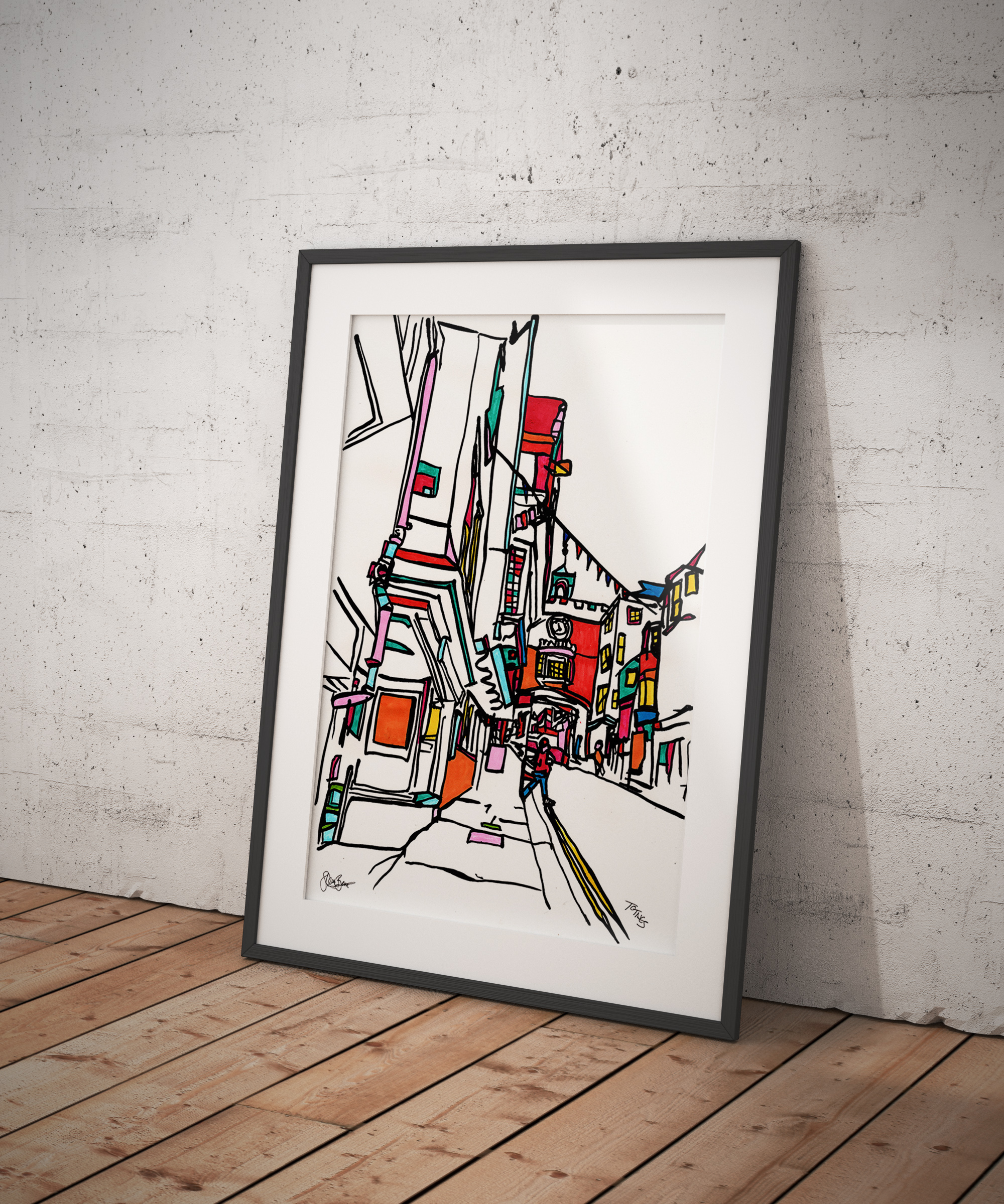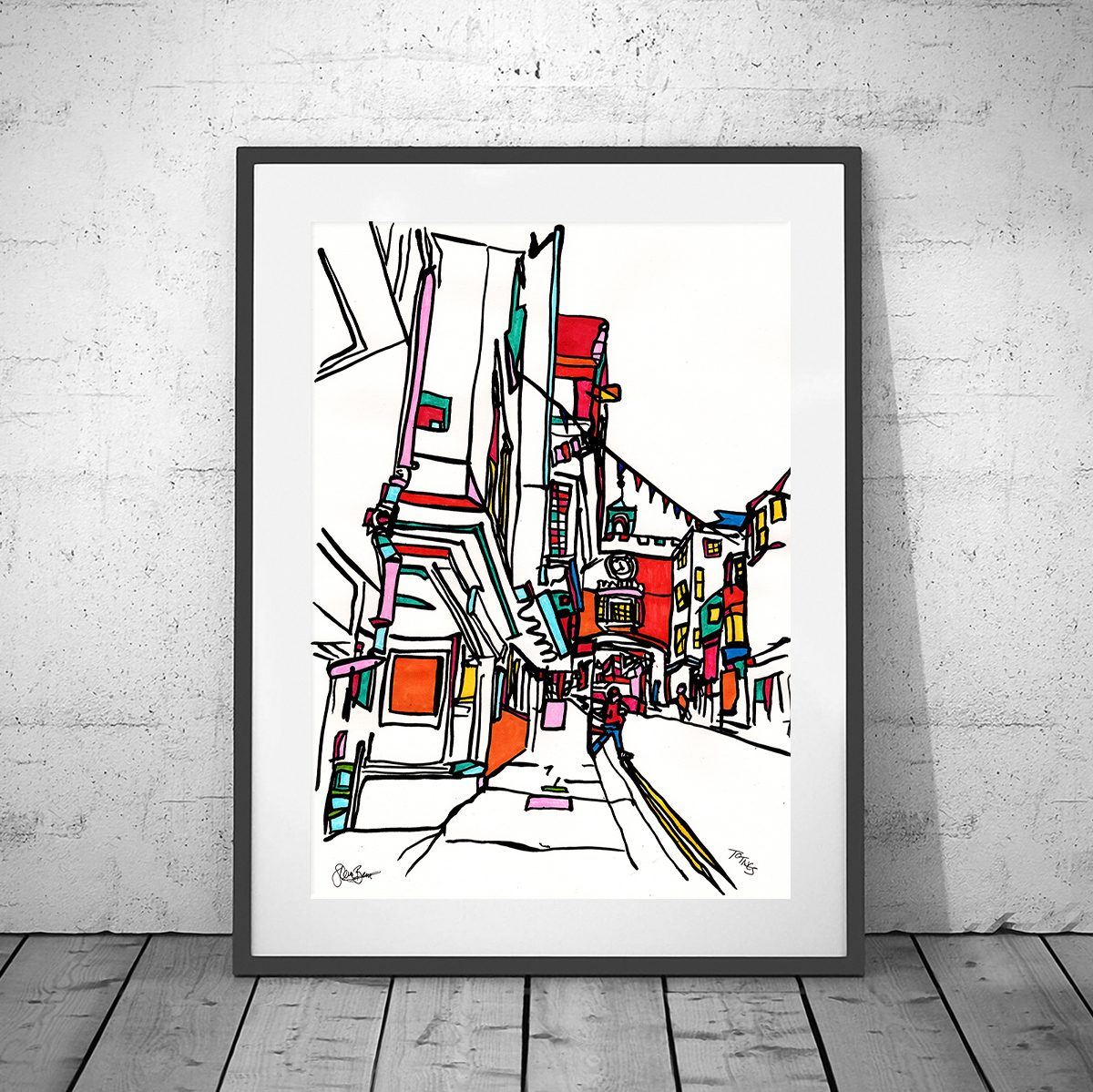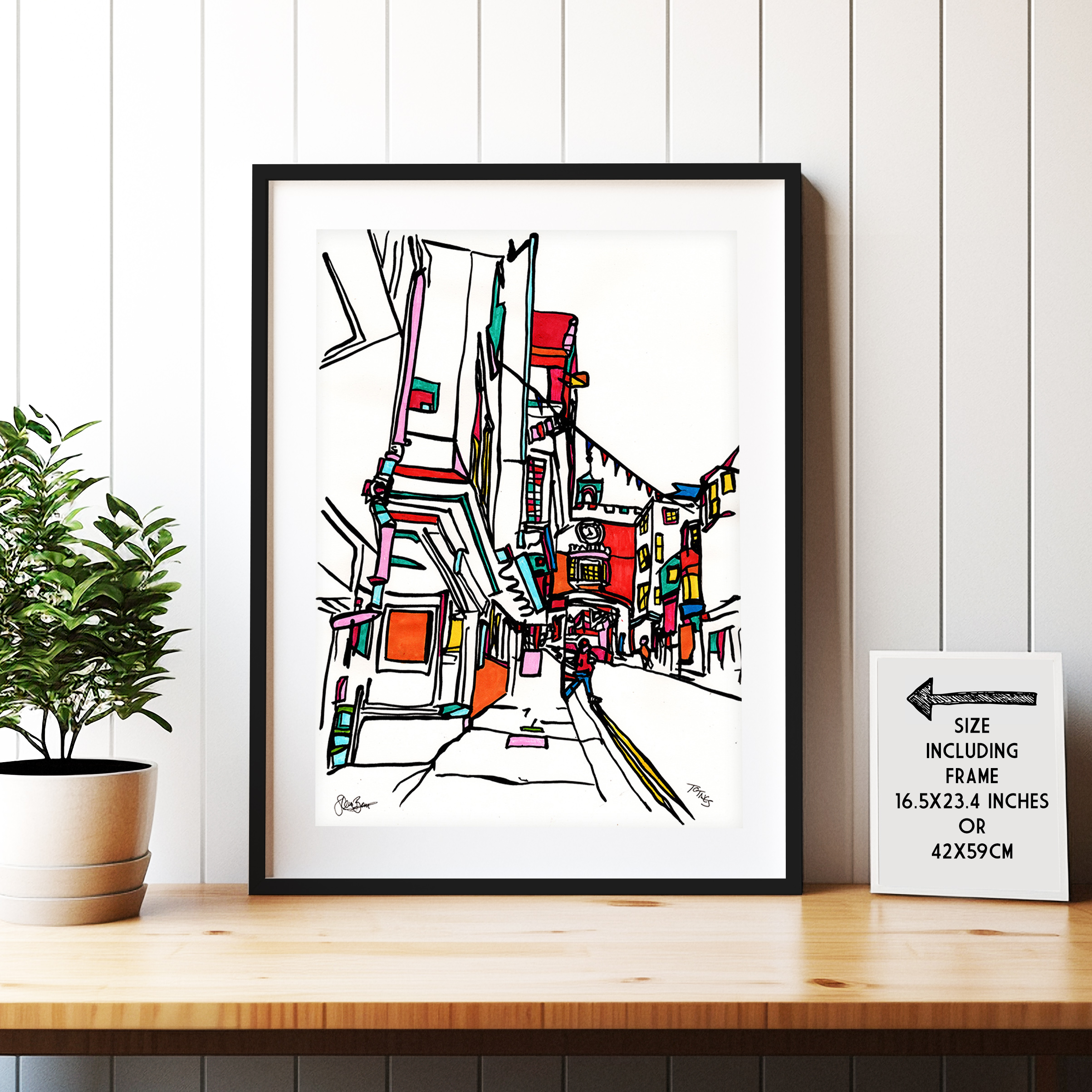 A framed original acrylic Totnes painting onto A3 (30x42cm), very lightly textured recycled cartridge paper.