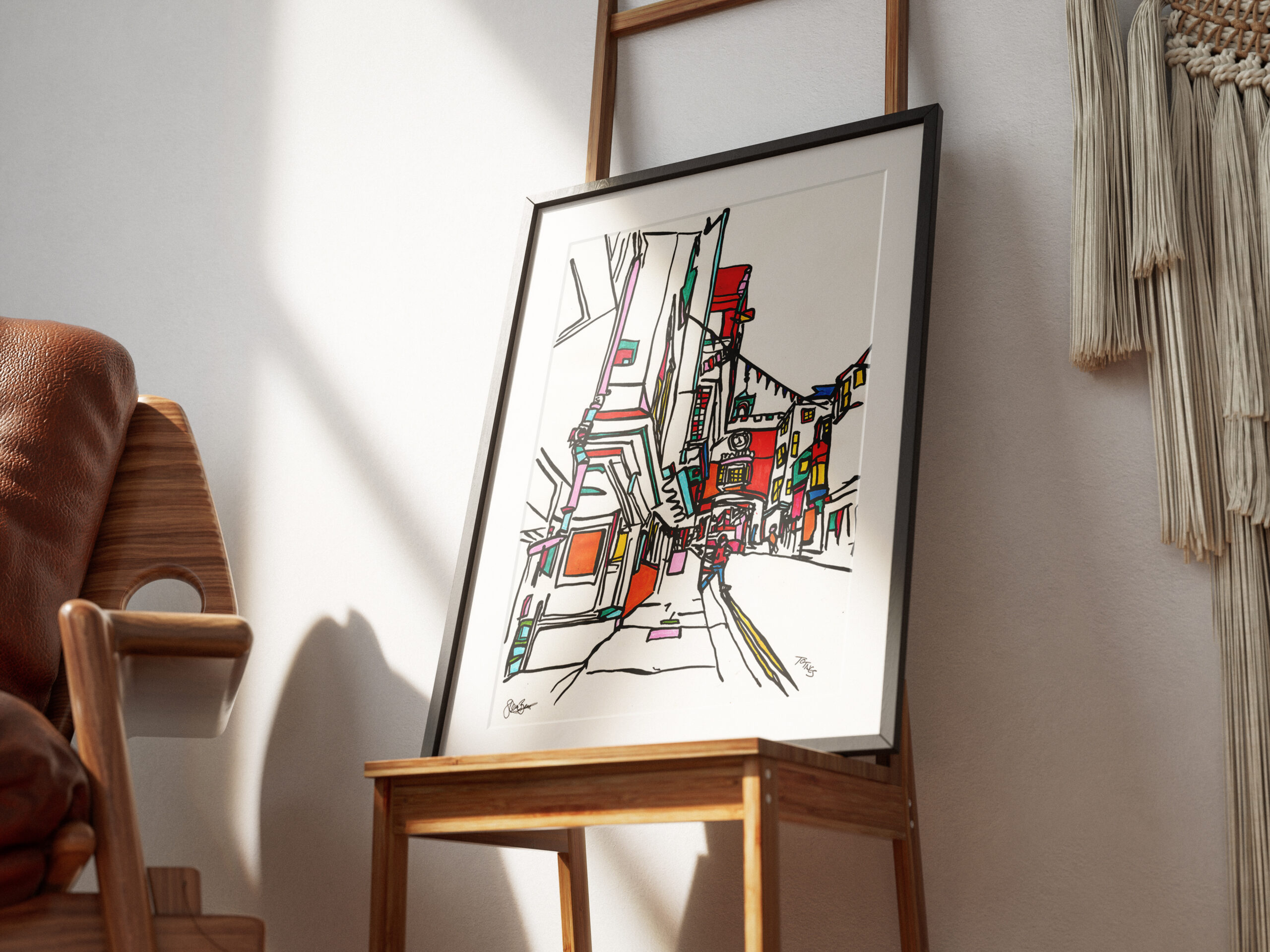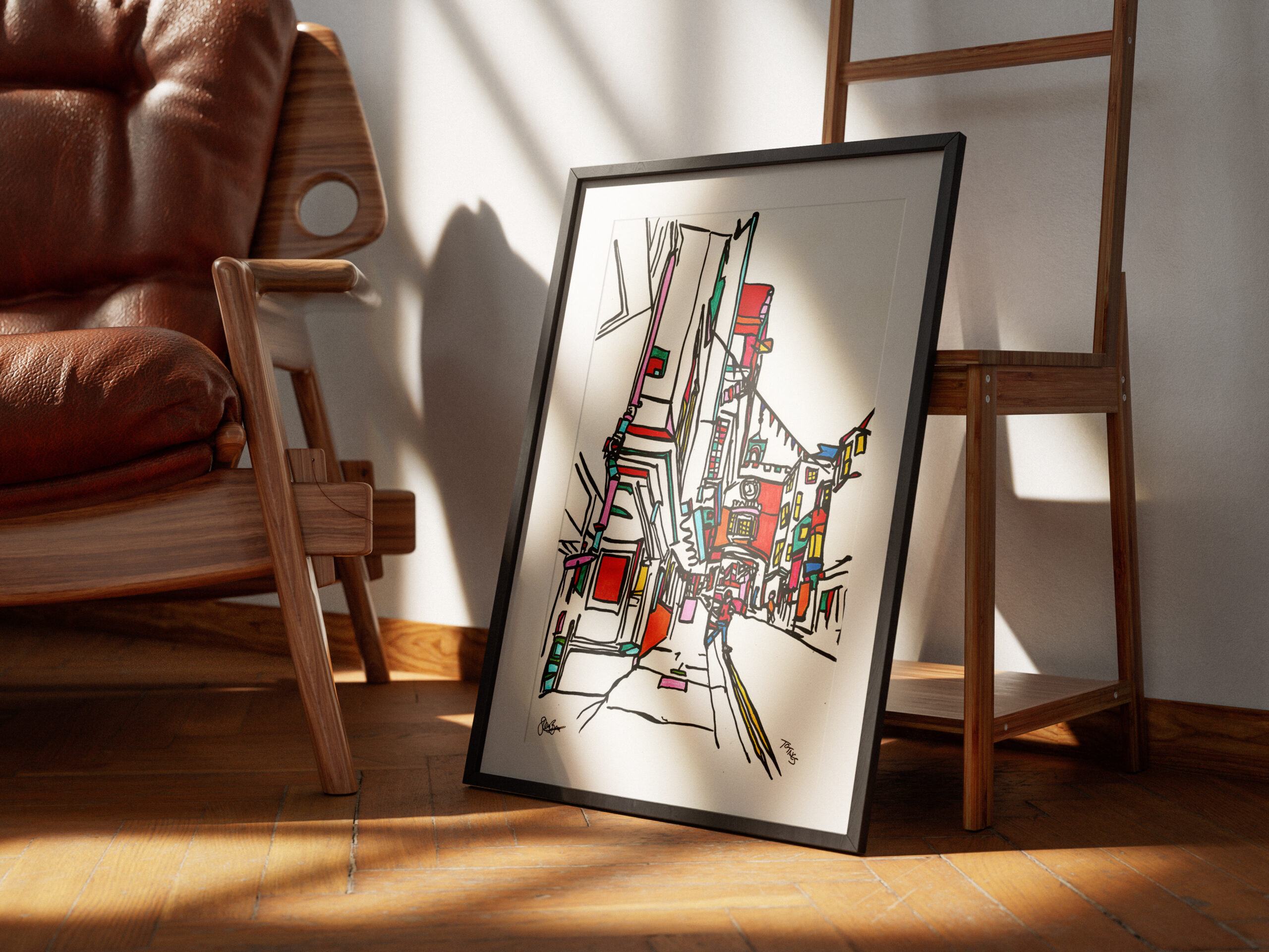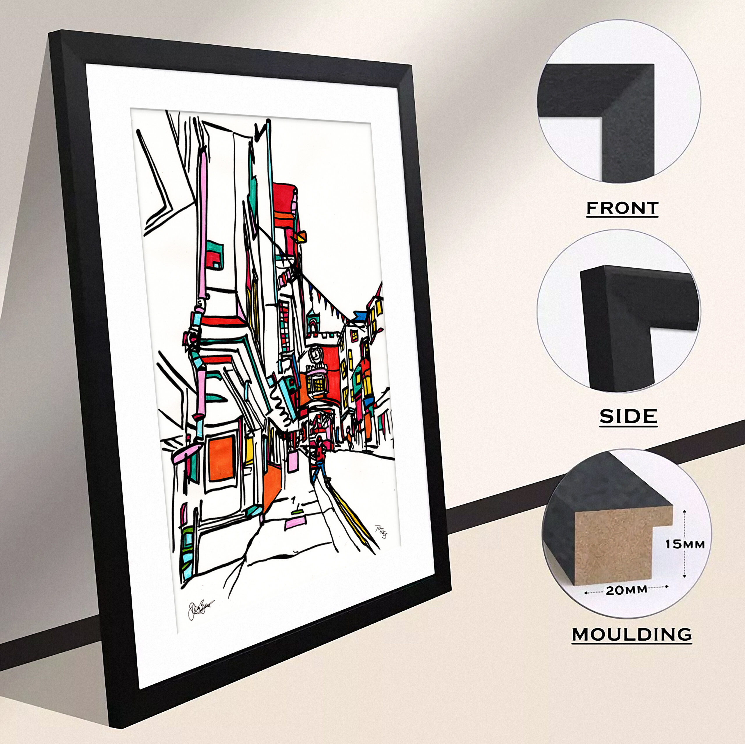 It will arrive with you framed in either plain UK-made Black, White or light Oak 20mm wide/15mm deep thin wood (MDF) with a white mount (the card surround) and is ready to hang straight from the box.