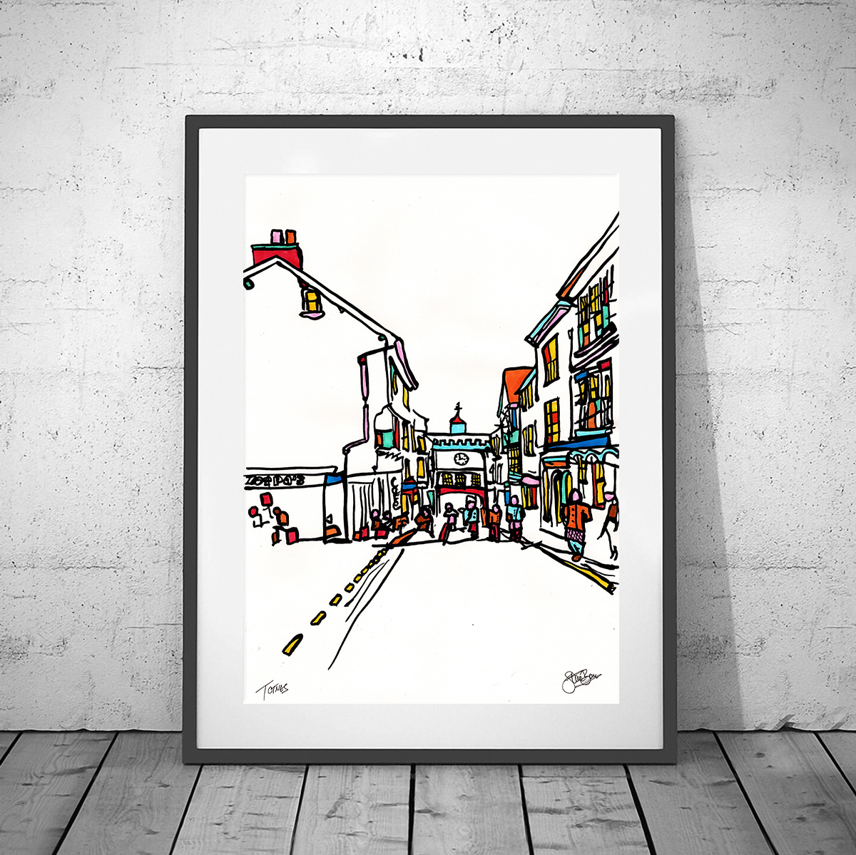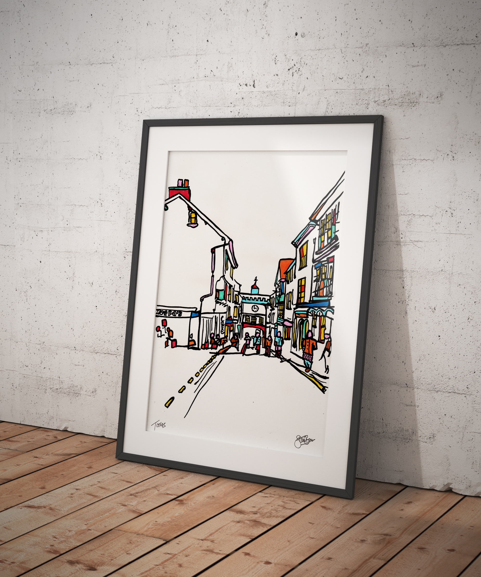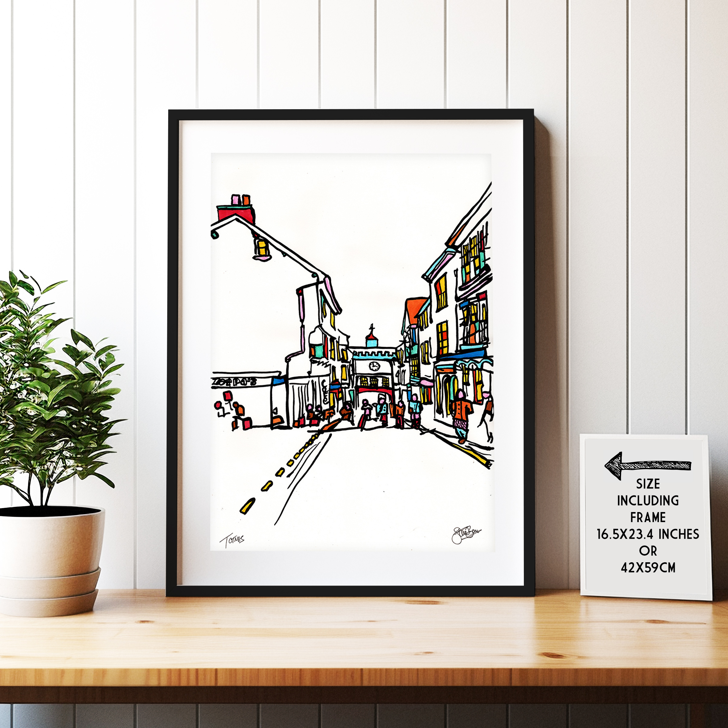 A framed original acrylic Totnes painting onto A3 (30x42cm), very lightly textured recycled cartridge paper.
