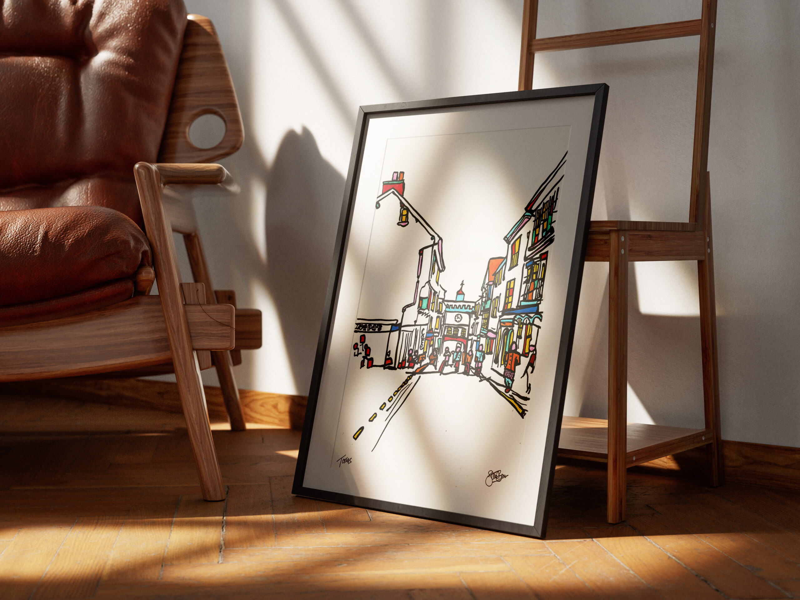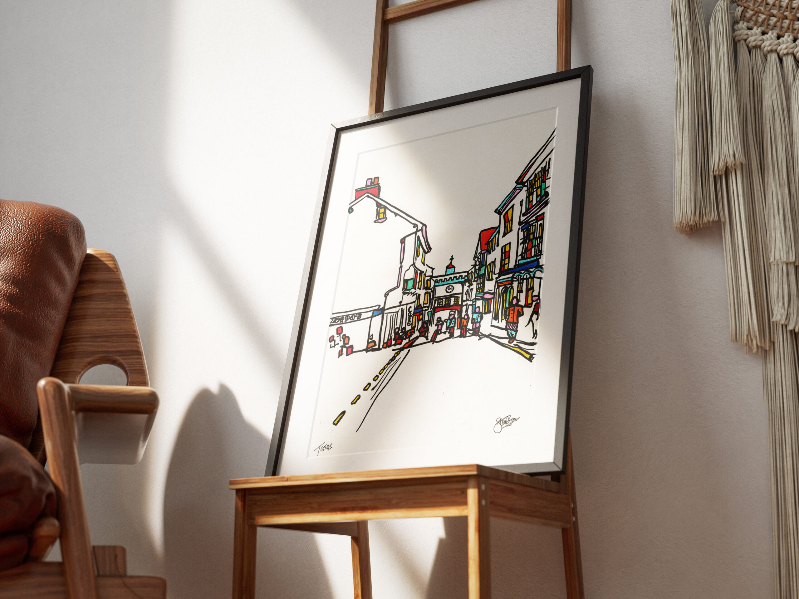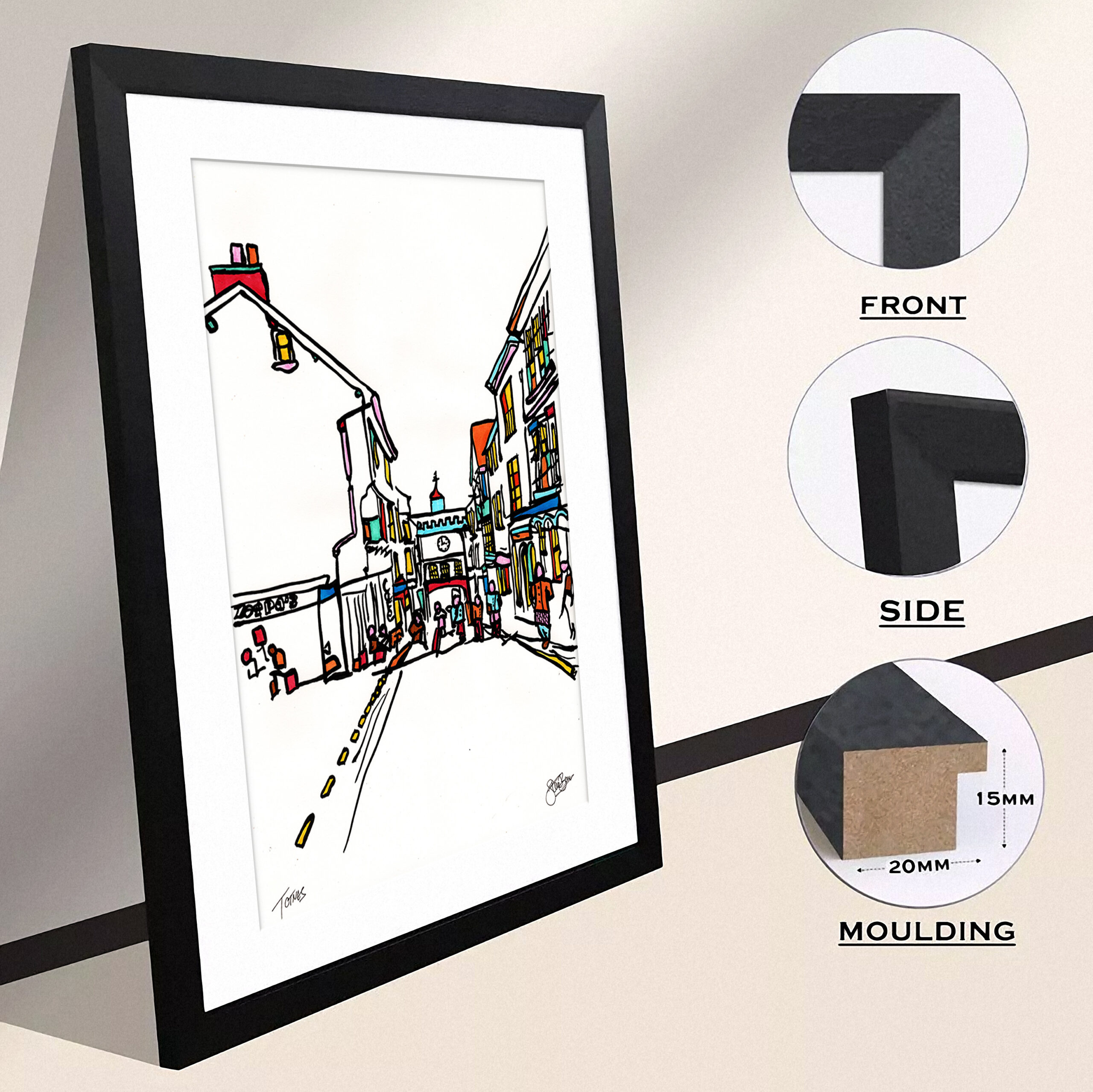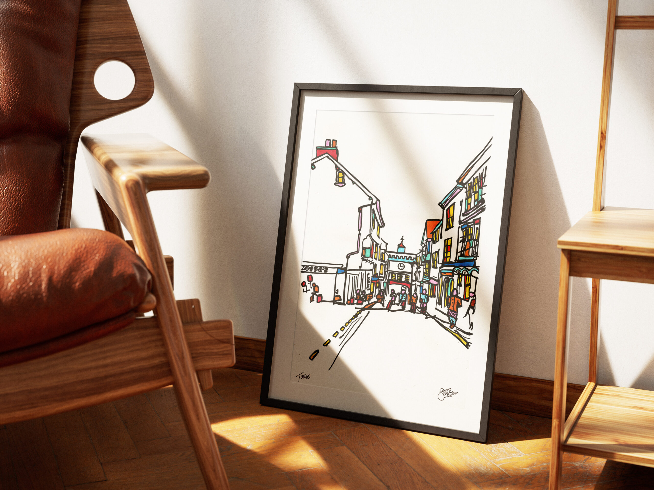 A framed original acrylic Totnes painting onto A3 (30x42cm), very lightly textured recycled cartridge paper.