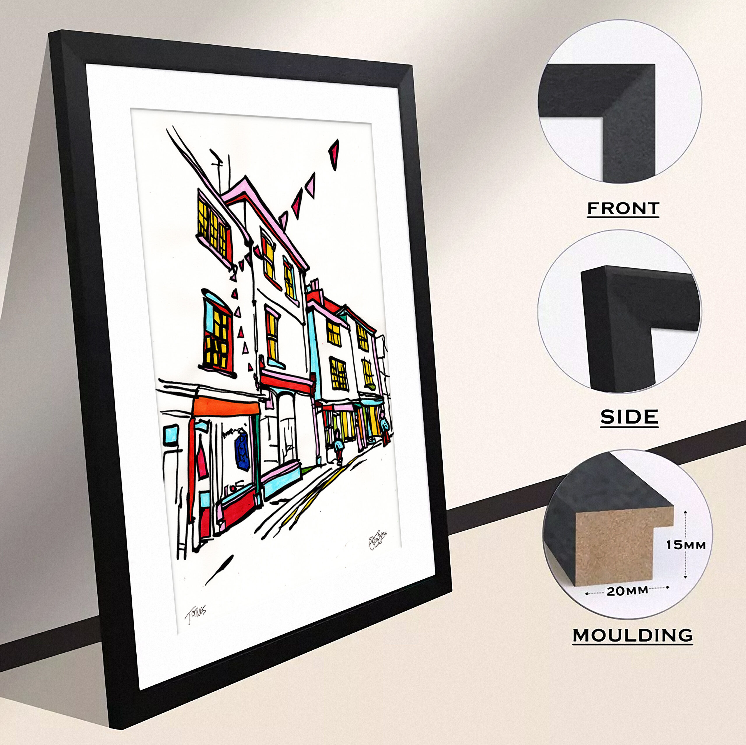 It will arrive with you framed in either plain UK-made Black, White or light Oak 20mm wide/15mm deep thin wood (MDF) with a white mount (the card surround) and is ready to hang straight from the box.