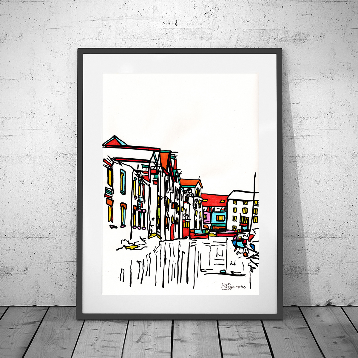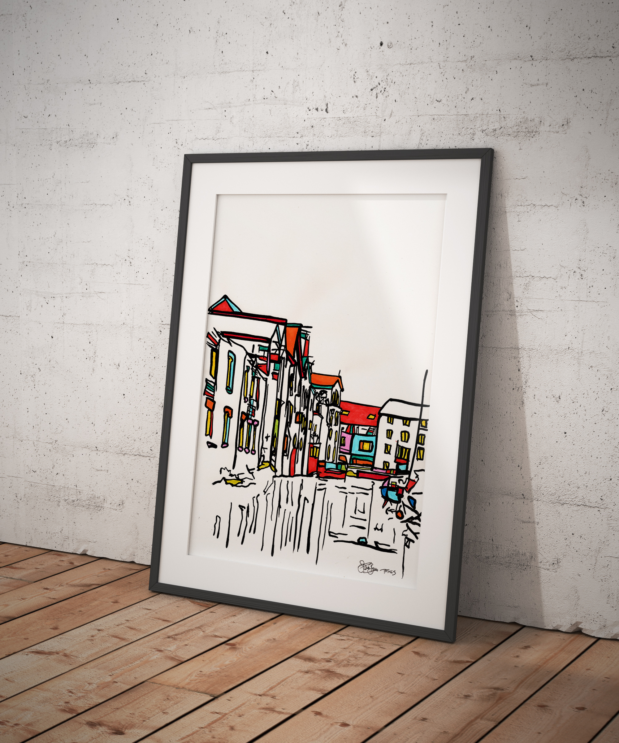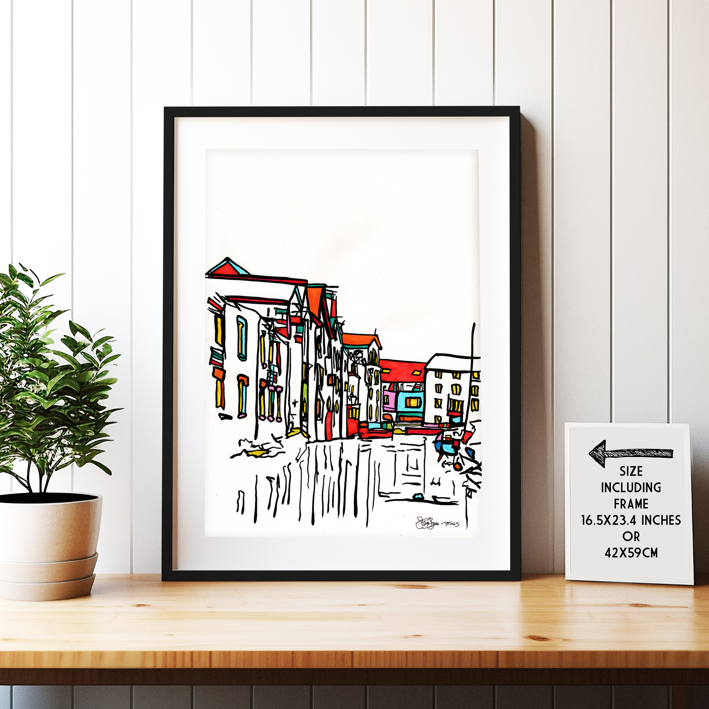 A framed original acrylic Totnes painting onto A3 (30x42cm), very lightly textured recycled cartridge paper.