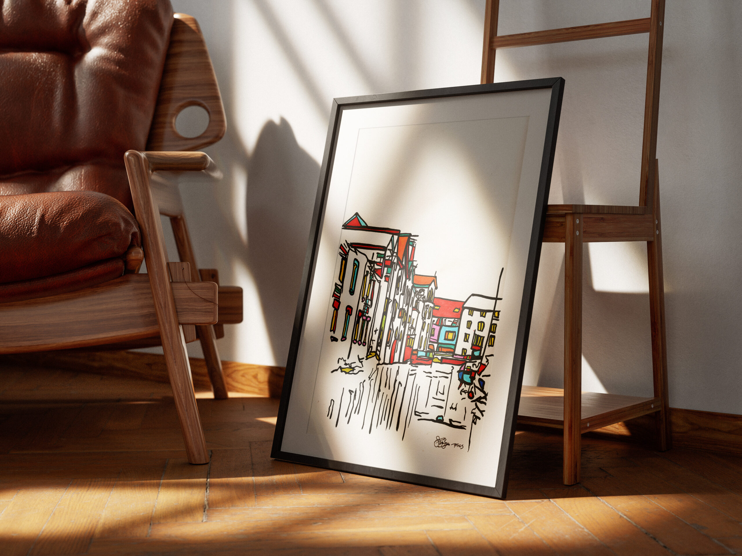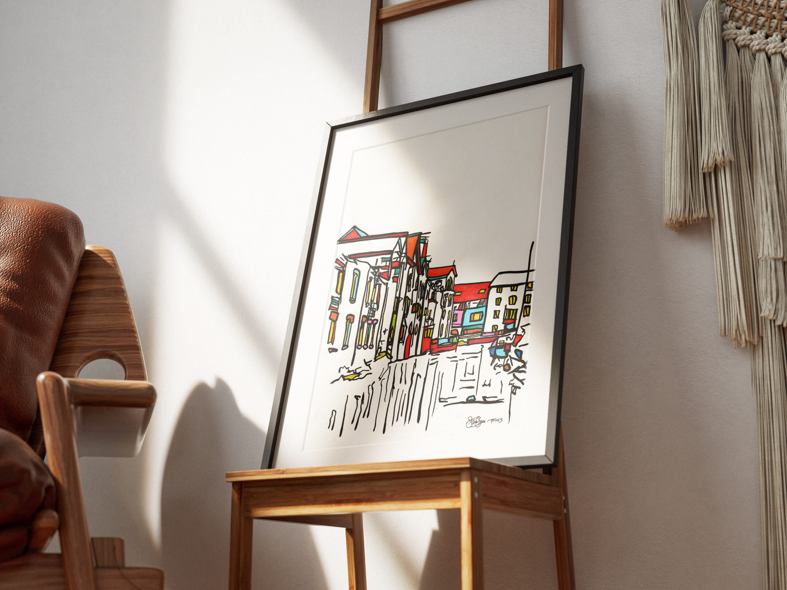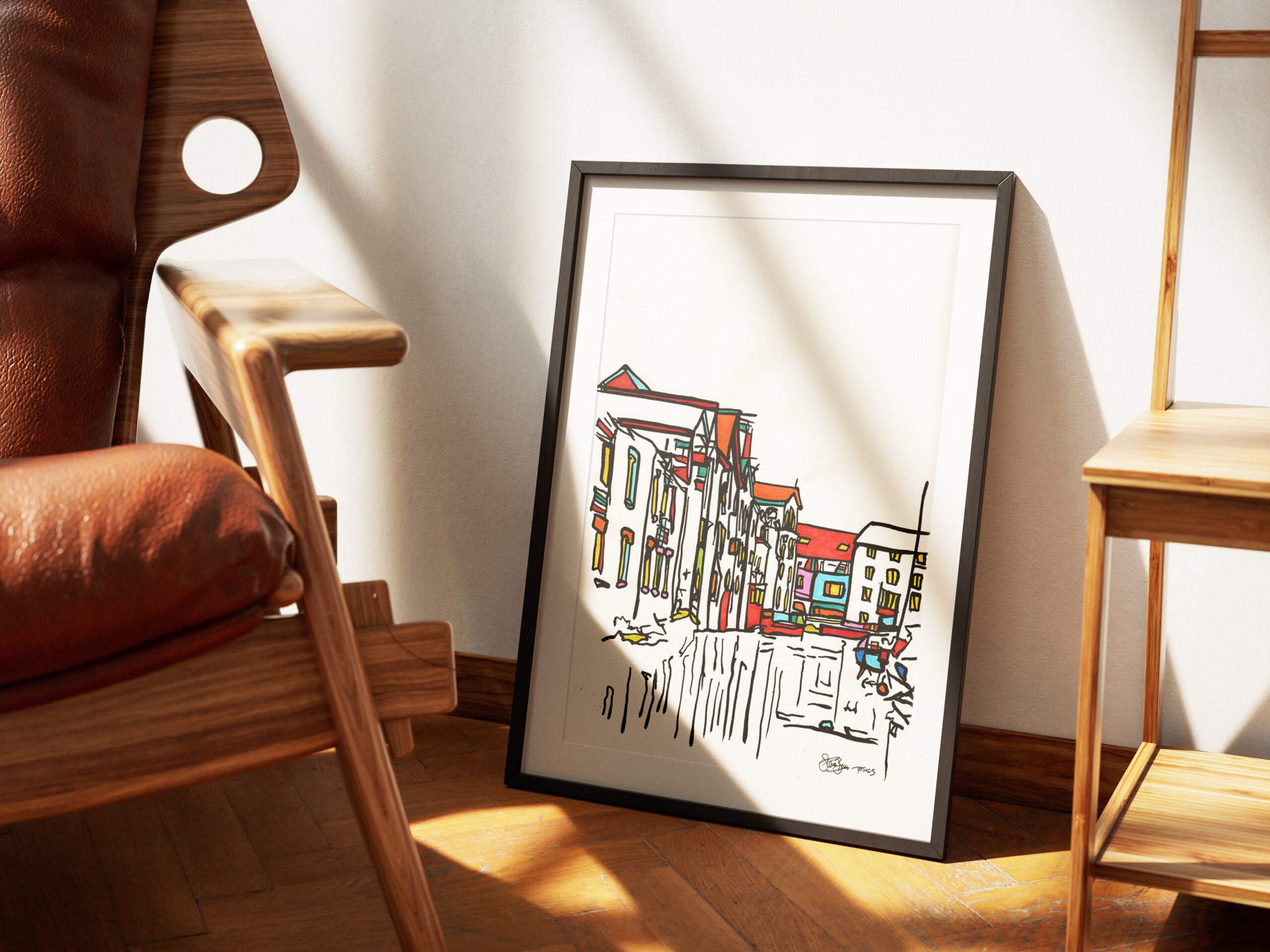 A framed original acrylic Totnes painting onto A3 (30x42cm), very lightly textured recycled cartridge paper.