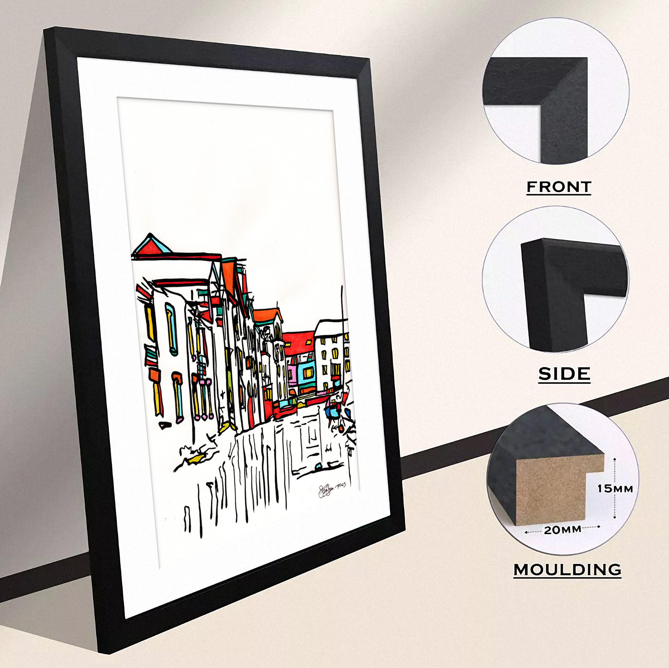 It will arrive with you framed in either plain UK-made Black, White or light Oak 20mm wide/15mm deep thin wood (MDF) with a white mount (the card surround) and is ready to hang straight from the box.