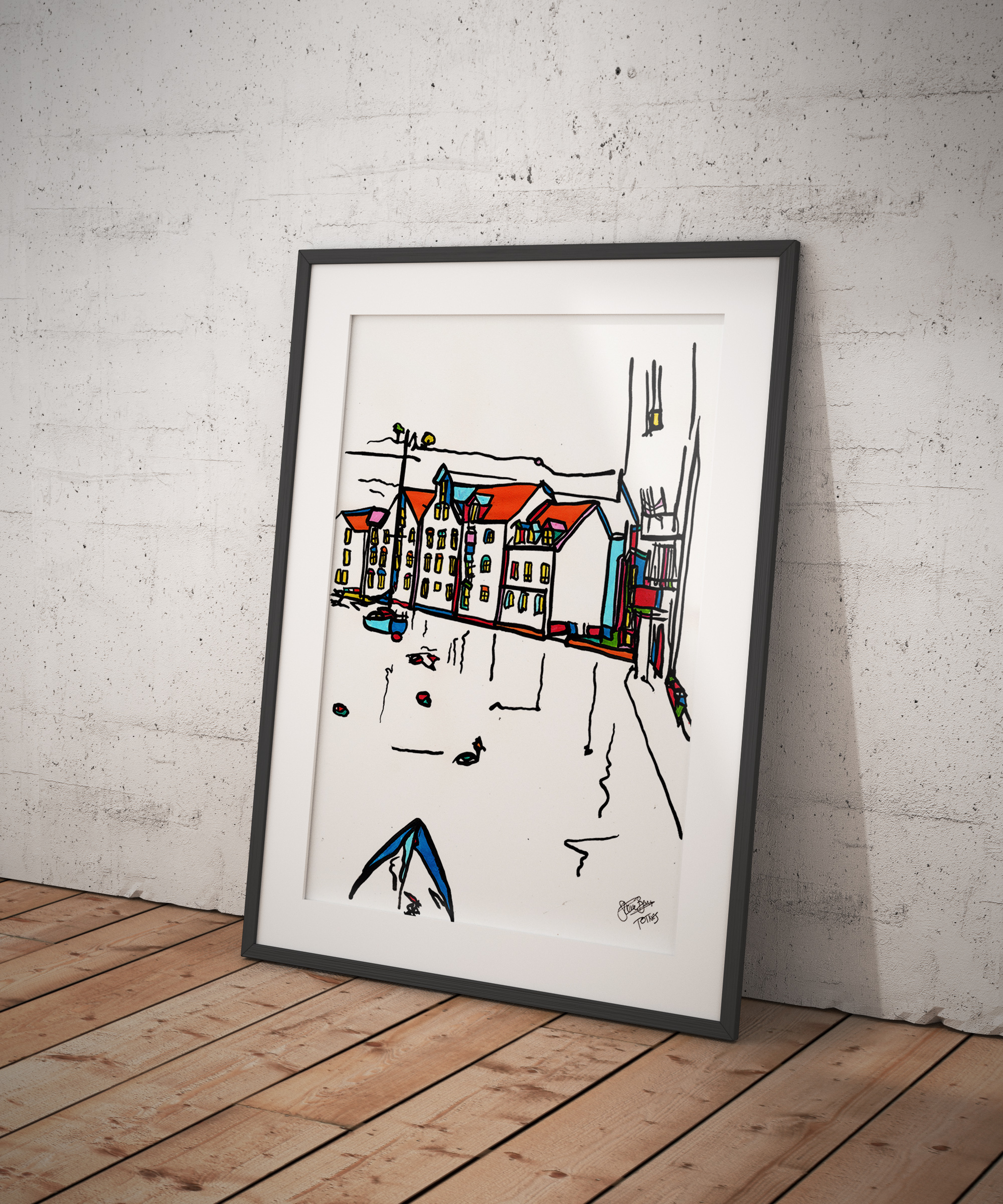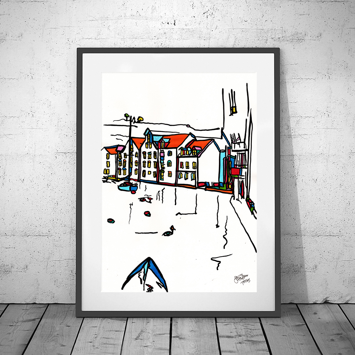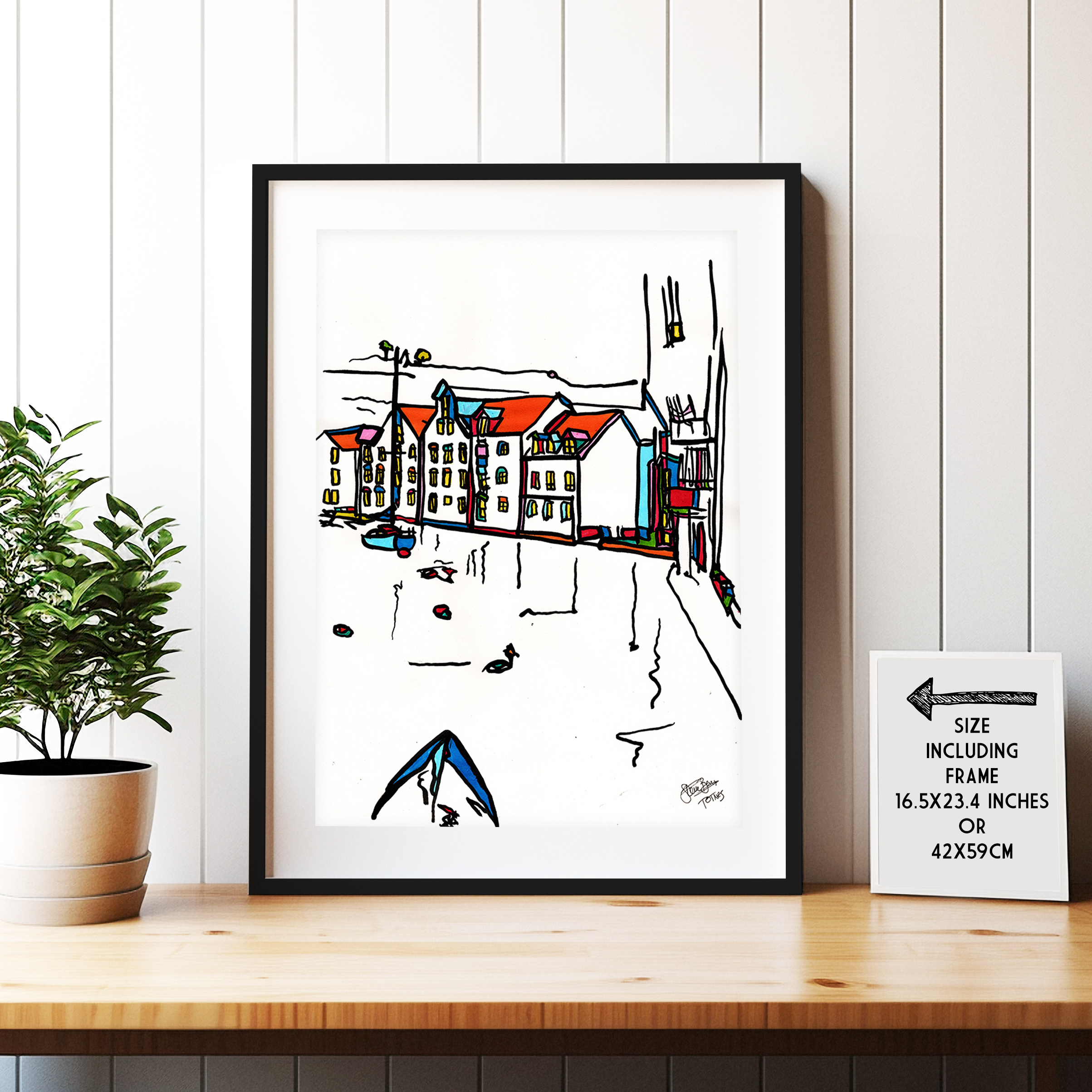 A framed original acrylic Totnes painting onto A3 (30x42cm), very lightly textured recycled cartridge paper.