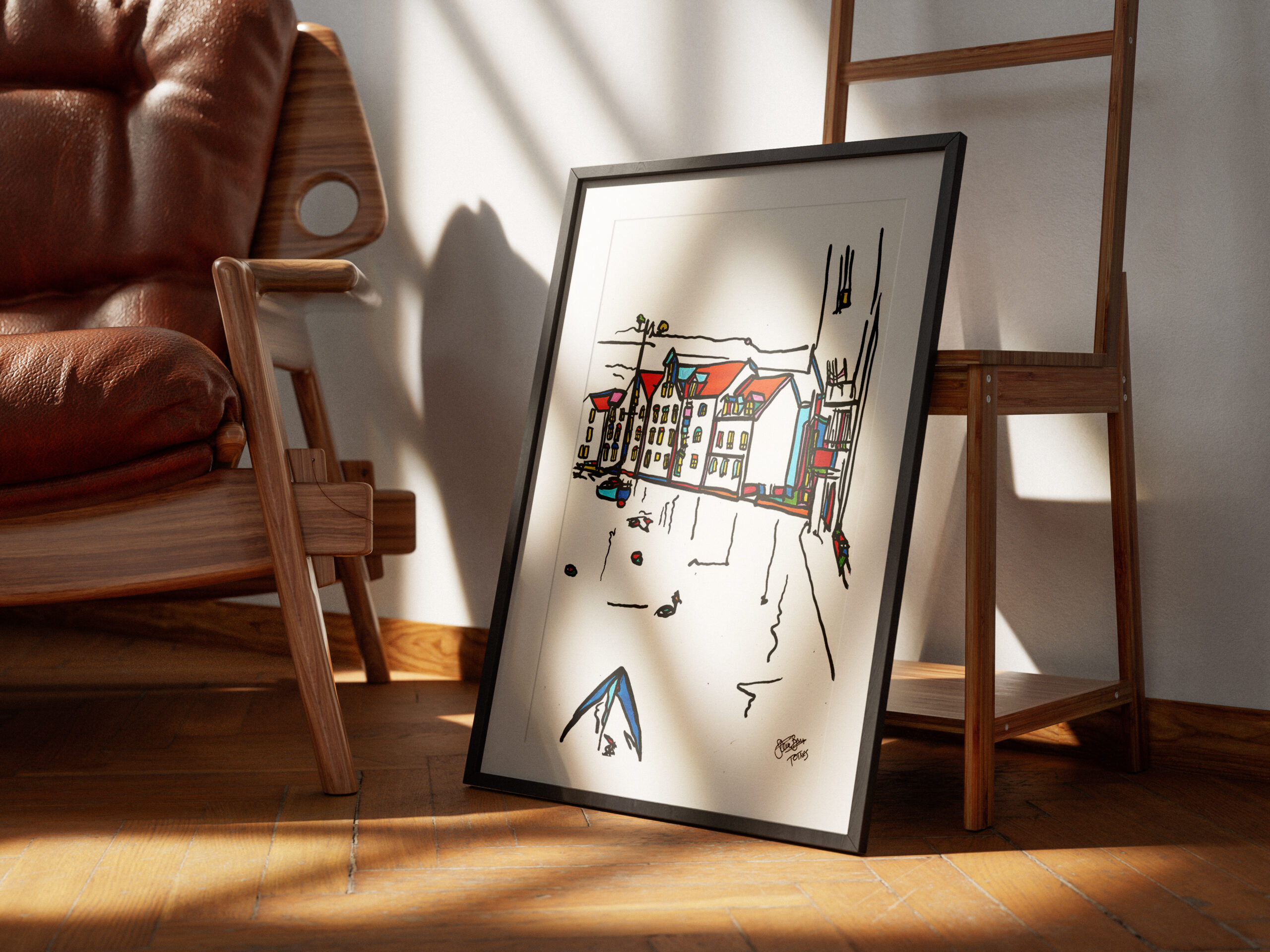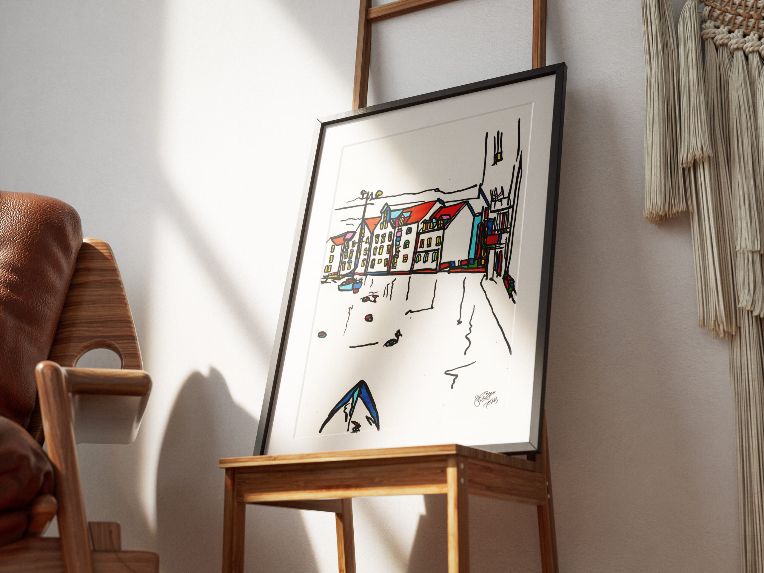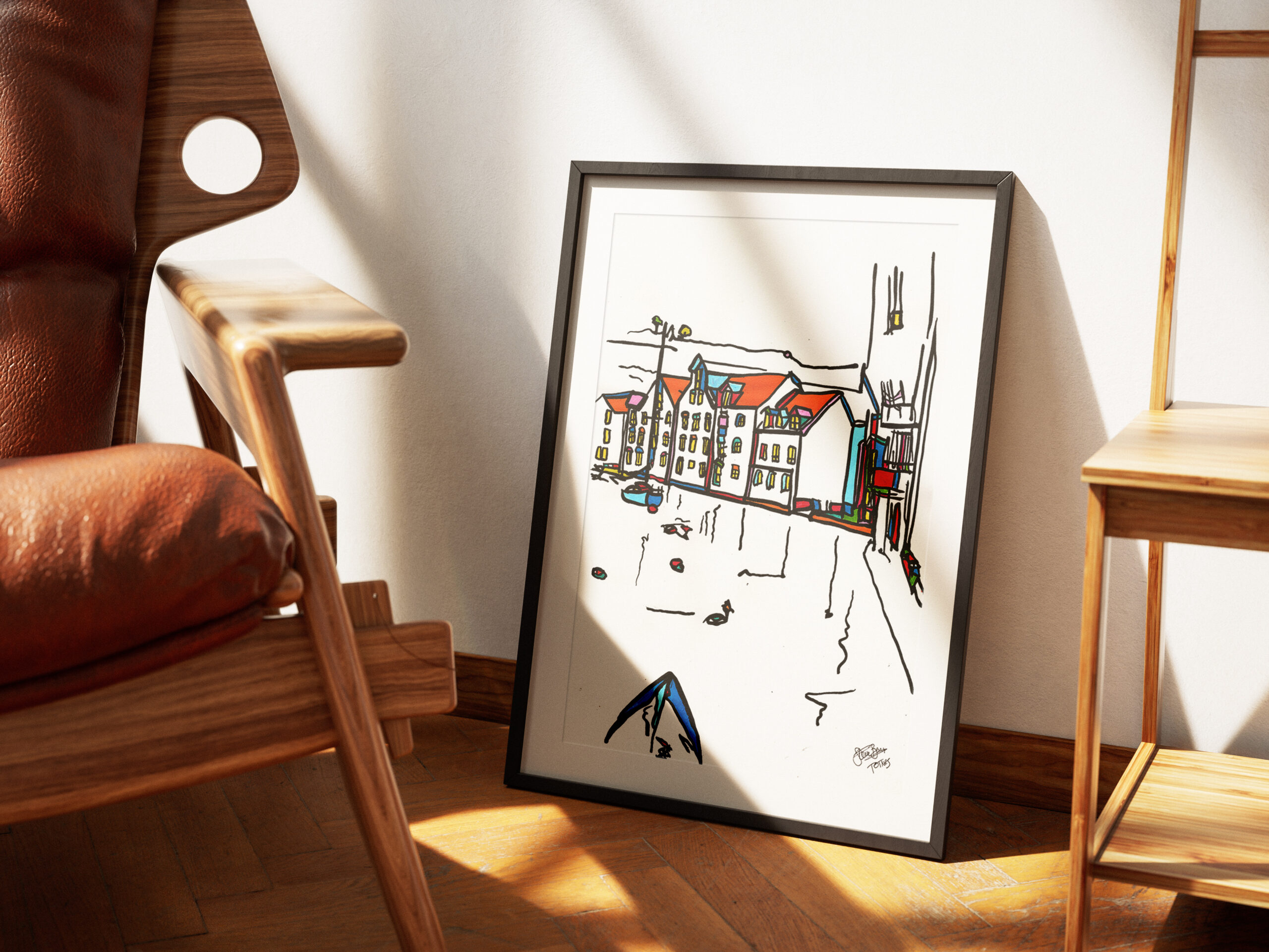 A framed original acrylic Totnes painting onto A3 (30x42cm), very lightly textured recycled cartridge paper.