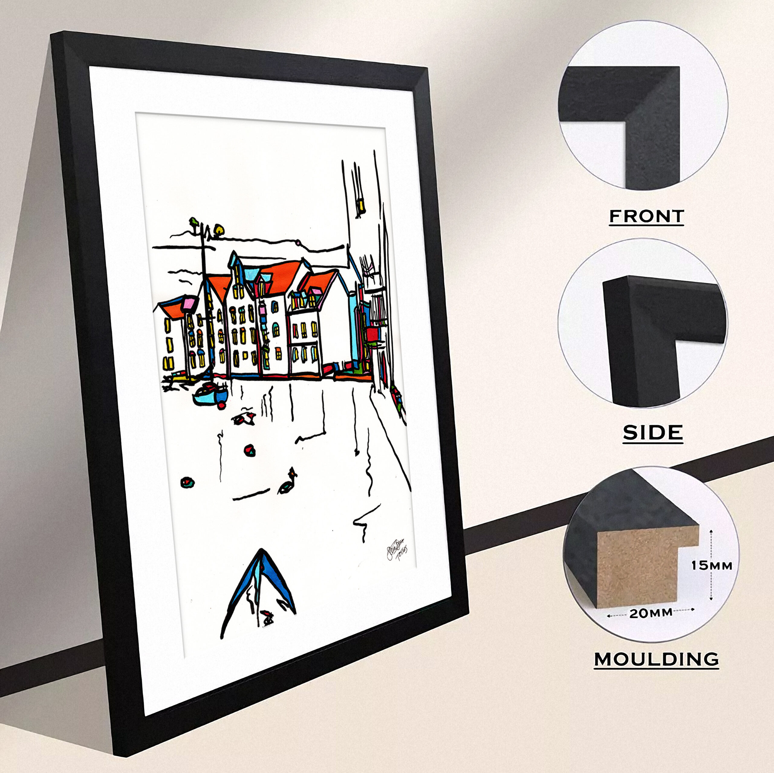 It will arrive with you framed in either plain UK-made Black, White or light Oak 20mm wide/15mm deep thin wood (MDF) with a white mount (the card surround) and is ready to hang straight from the box.